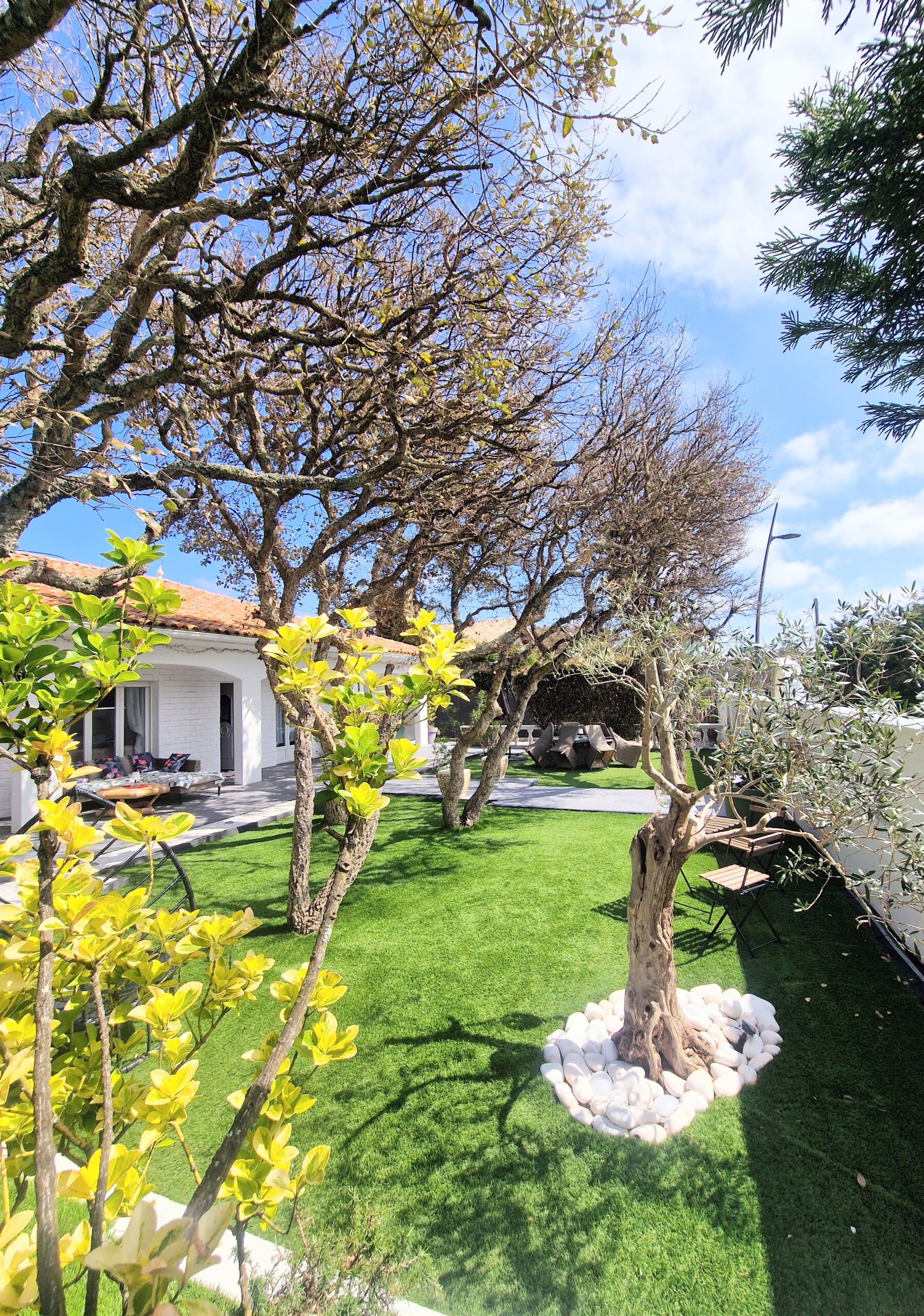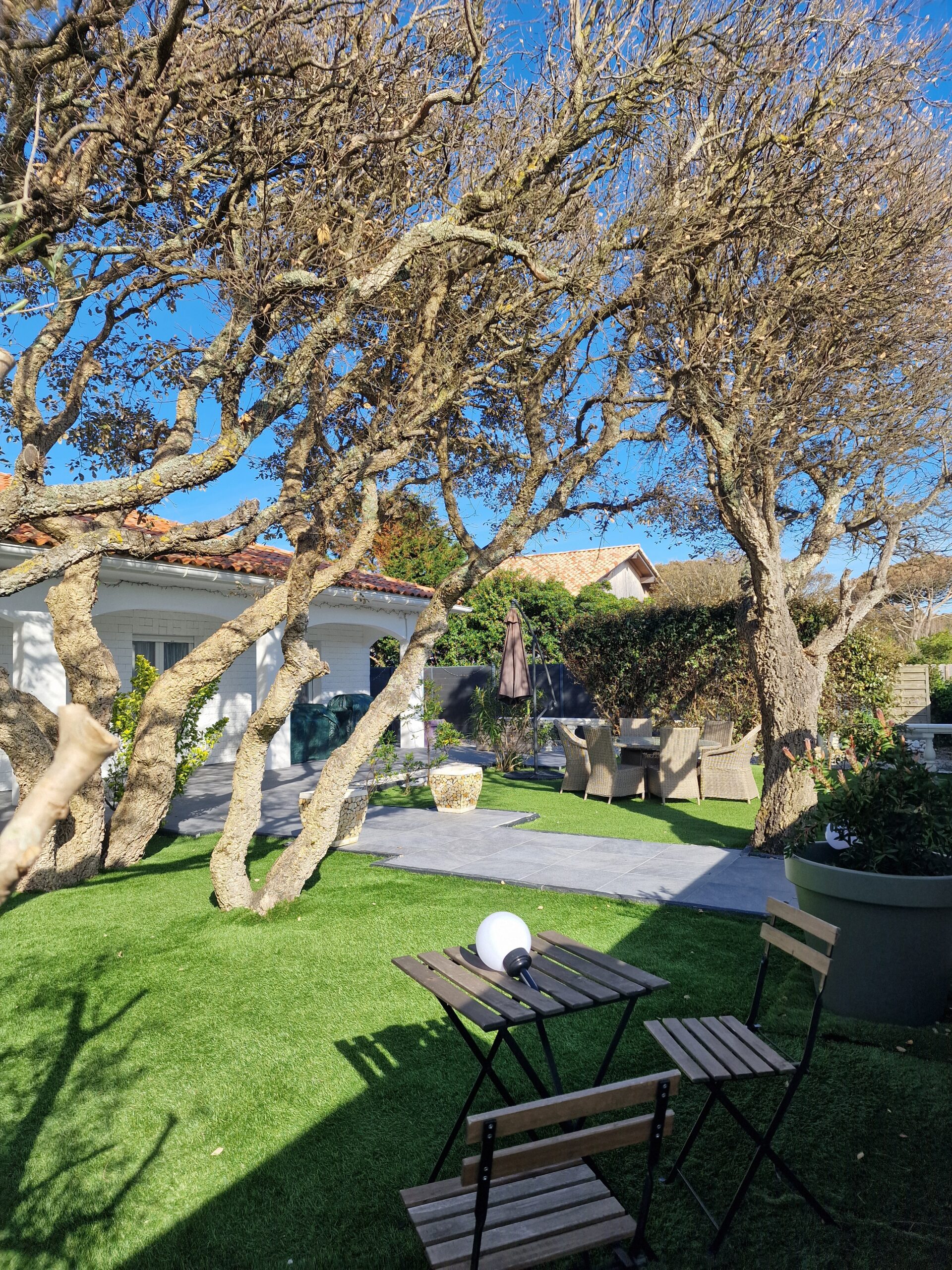 Nichée dans un écrin de verdure derrière la dune, dans un quartier résidentiel et calme en bord de plage.
