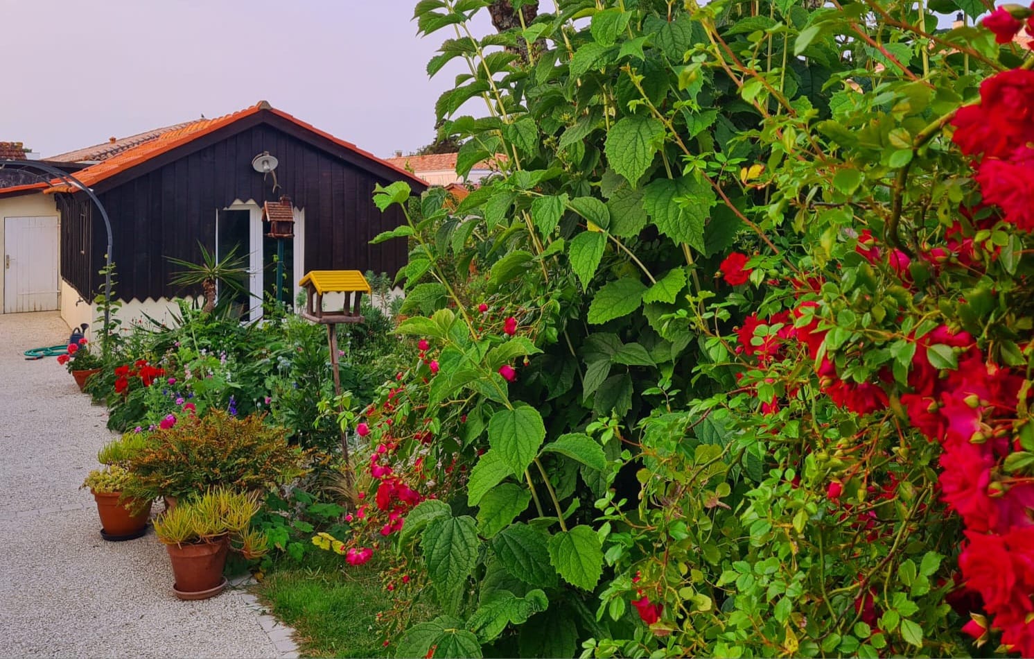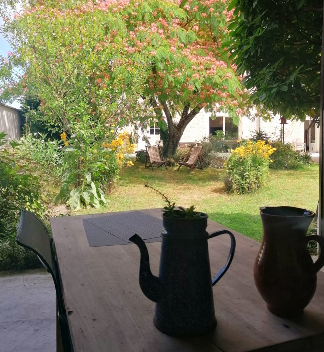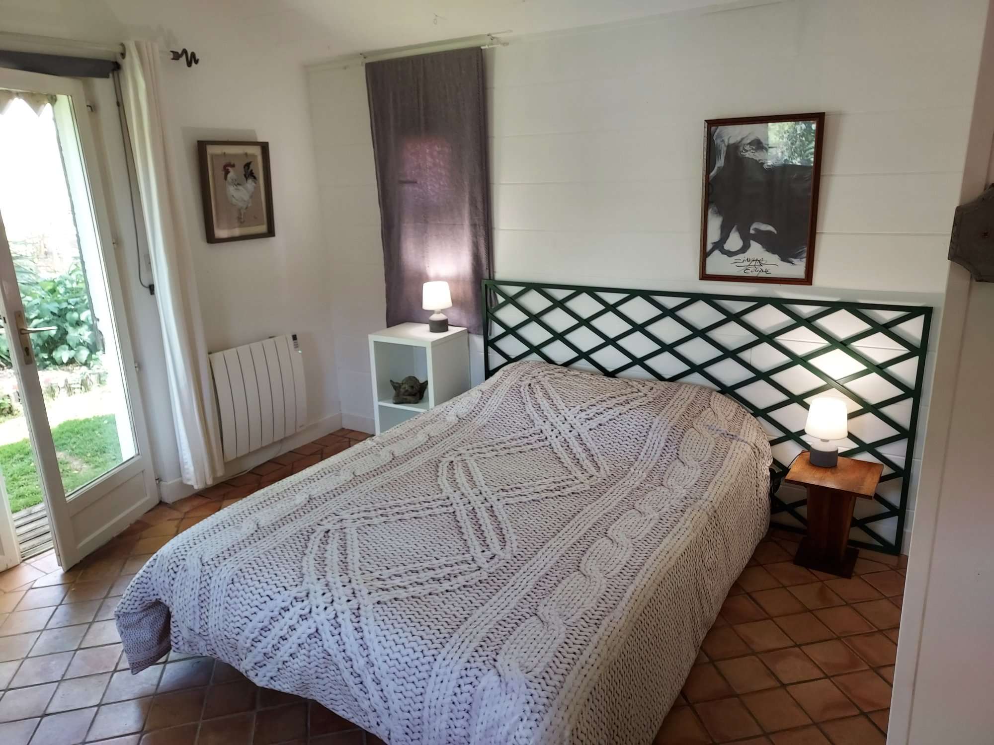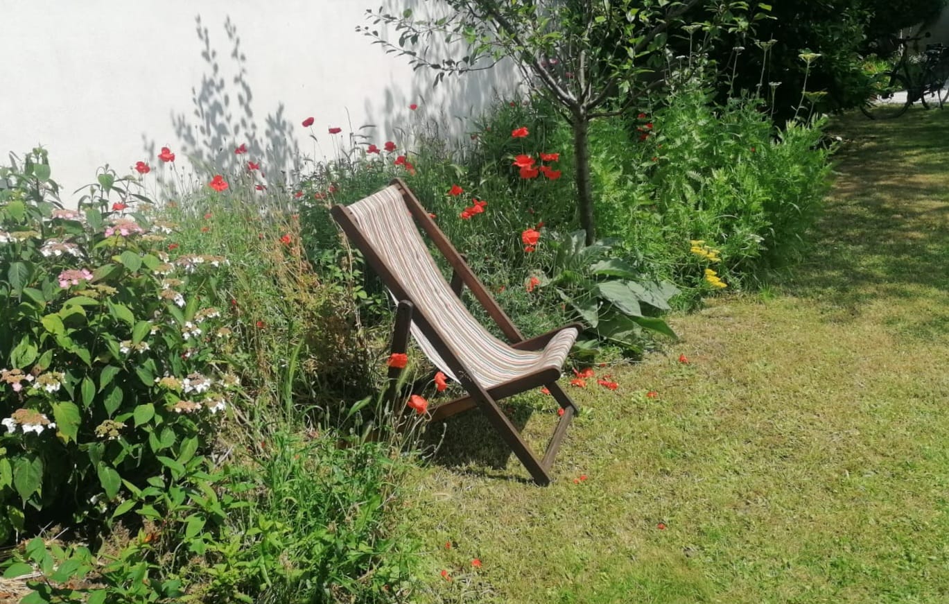 Une chambre confortable de 20 m², lit double, et sa salle de bain (douche, lavabo, WC) dans la fraîcheur d’un jardin ombragé et fleuri de 500 m² avec terrasse, possibilité d’un lit pour bébé.