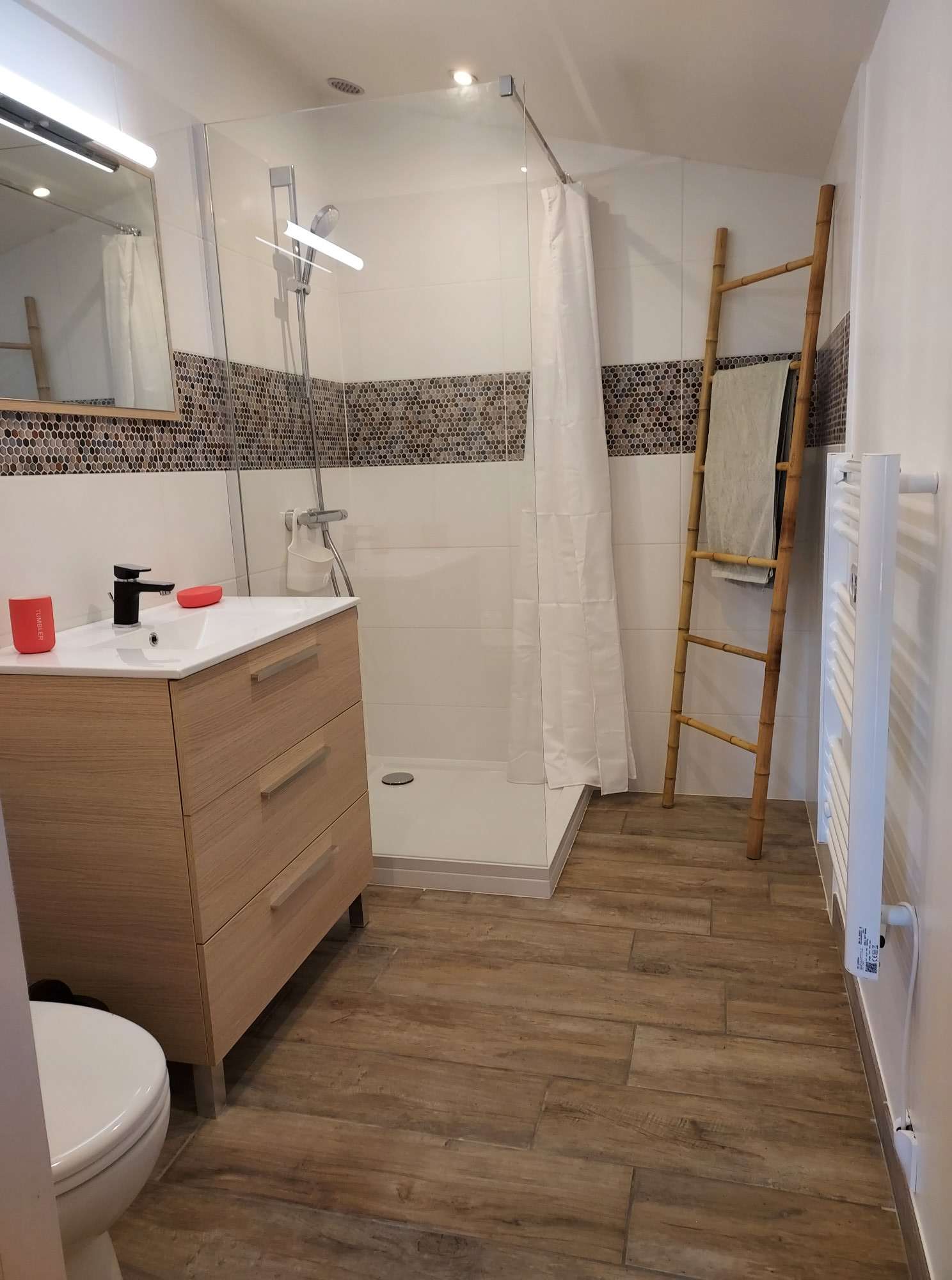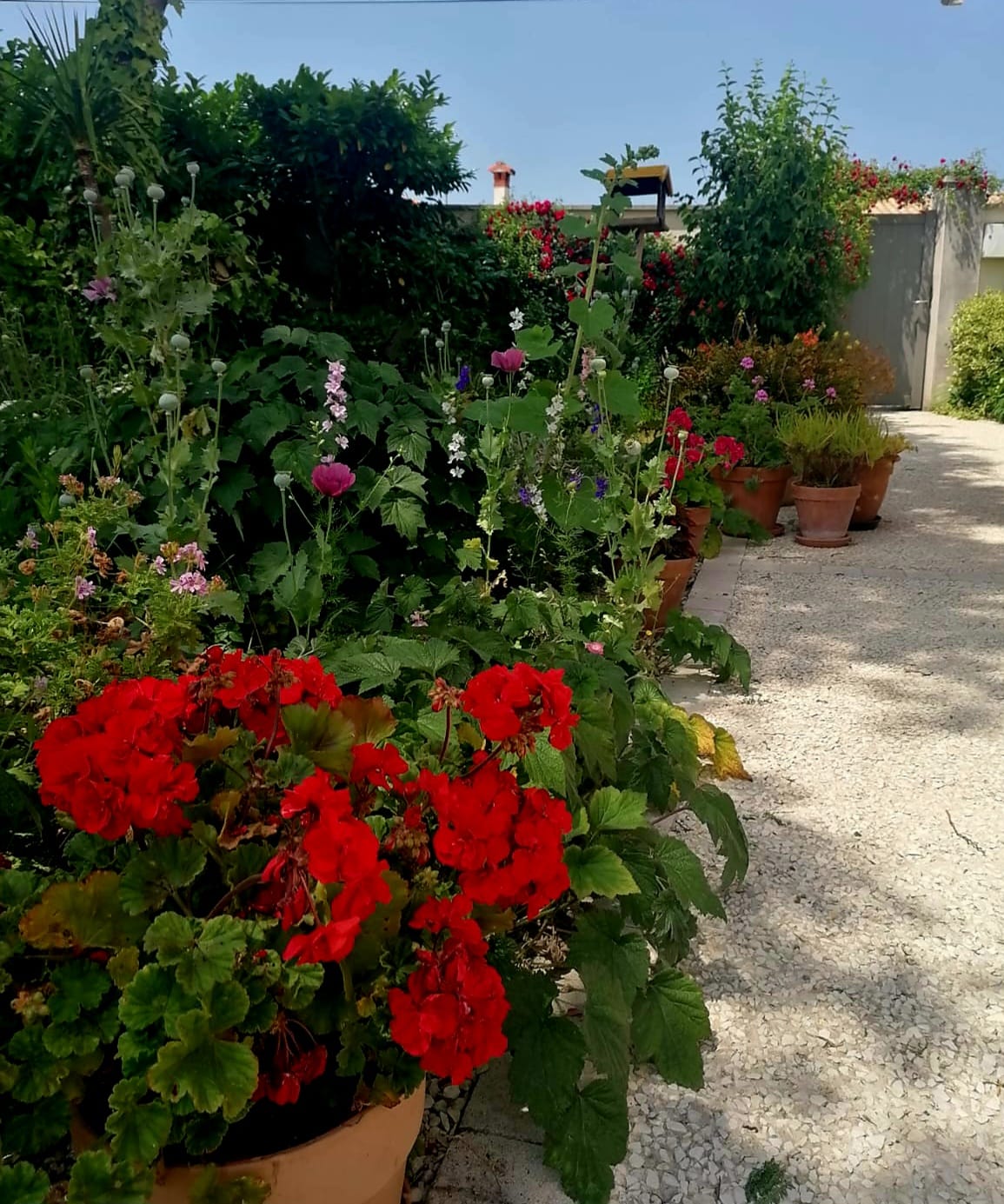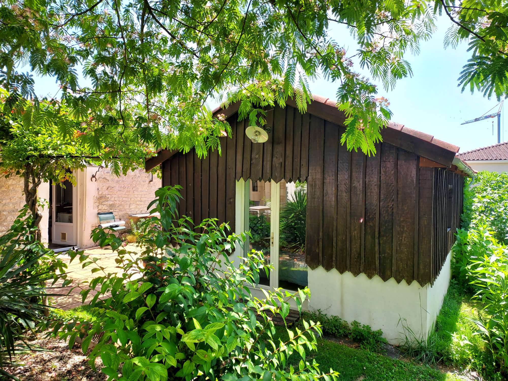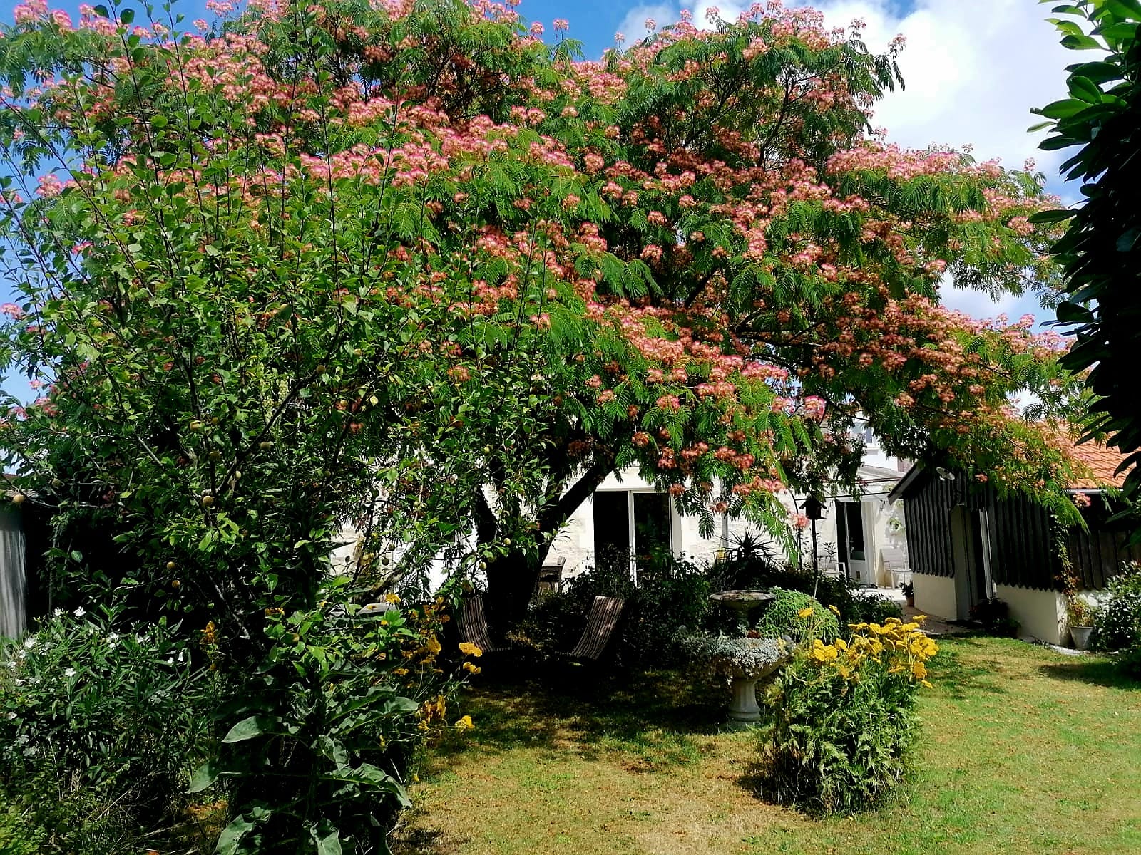 Une chambre confortable de 20 m², lit double, et sa salle de bain (douche, lavabo, WC) dans la fraîcheur d’un jardin ombragé et fleuri de 500 m² avec terrasse, possibilité d’un lit pour bébé.