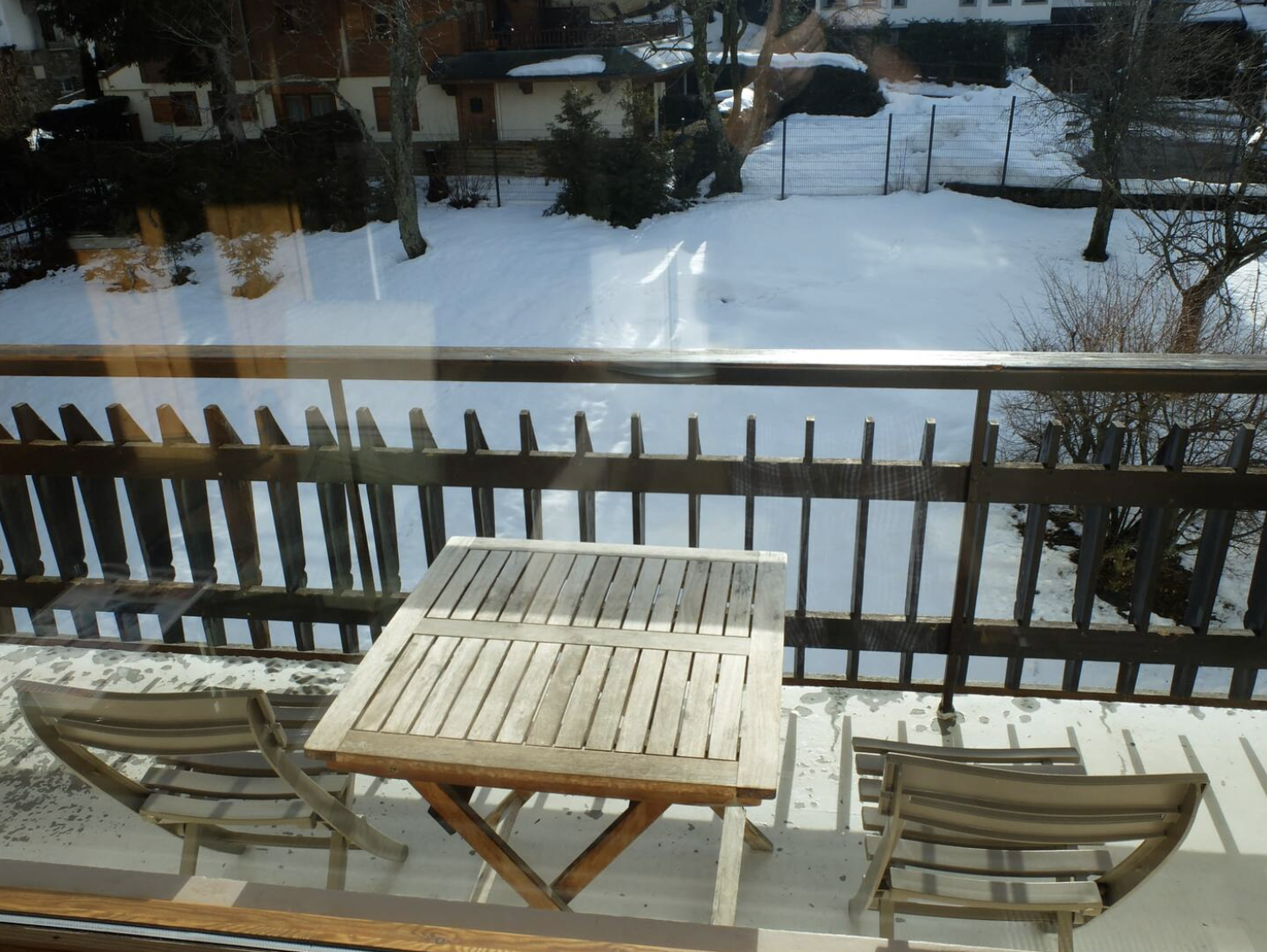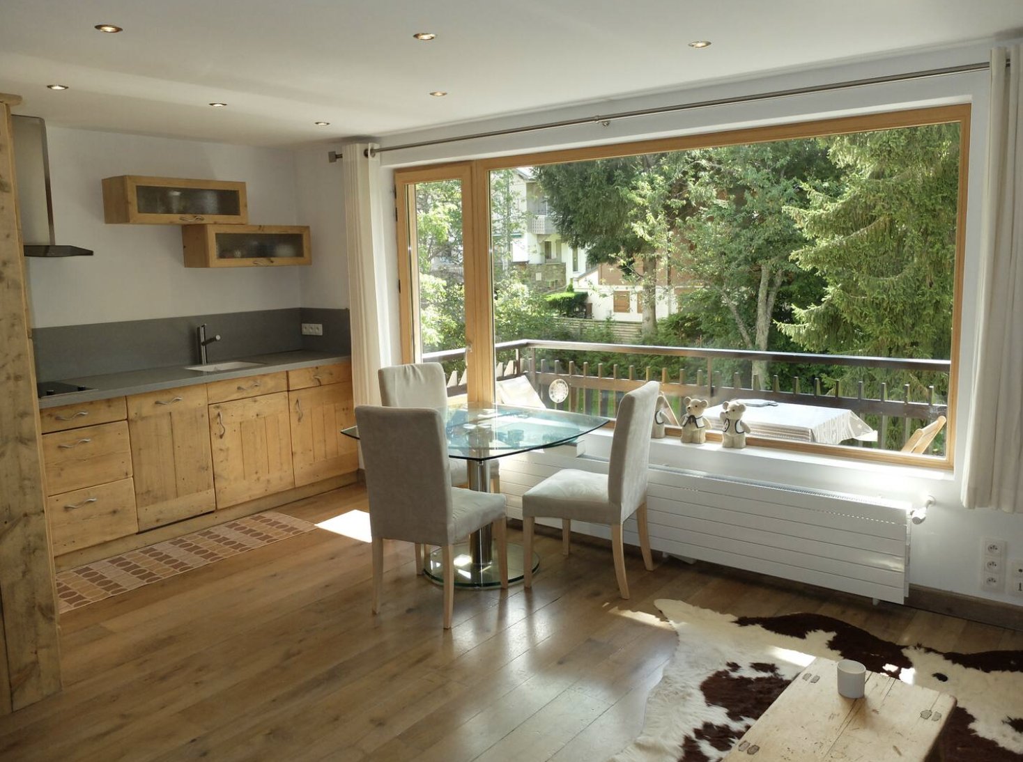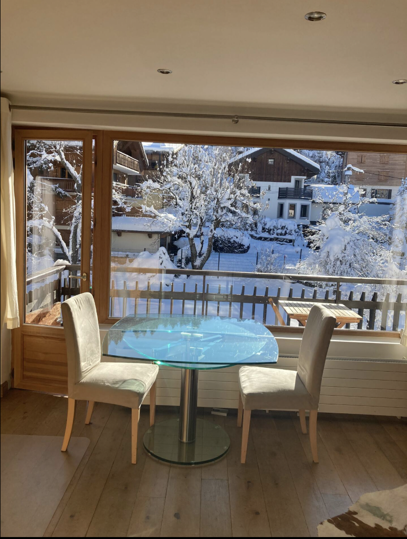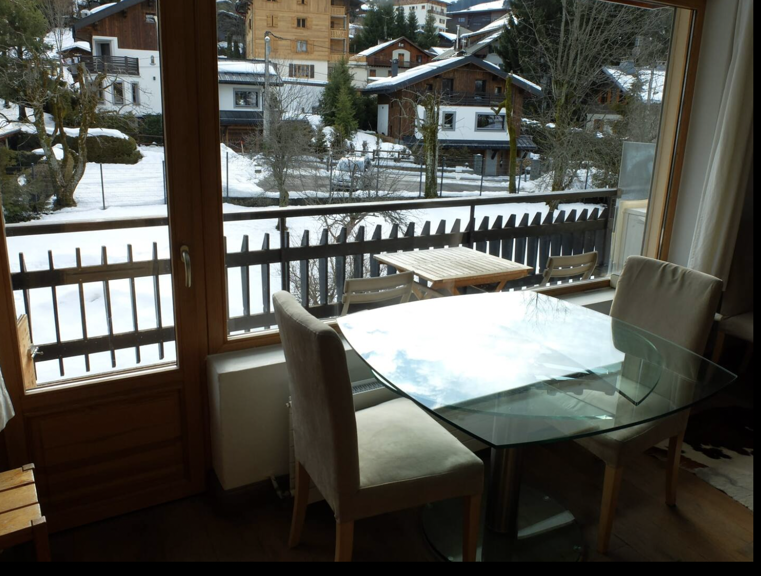 Espace de vie montagne et ultra moderne de grande qualité. Balcon ensoleillé avec table et chaises.