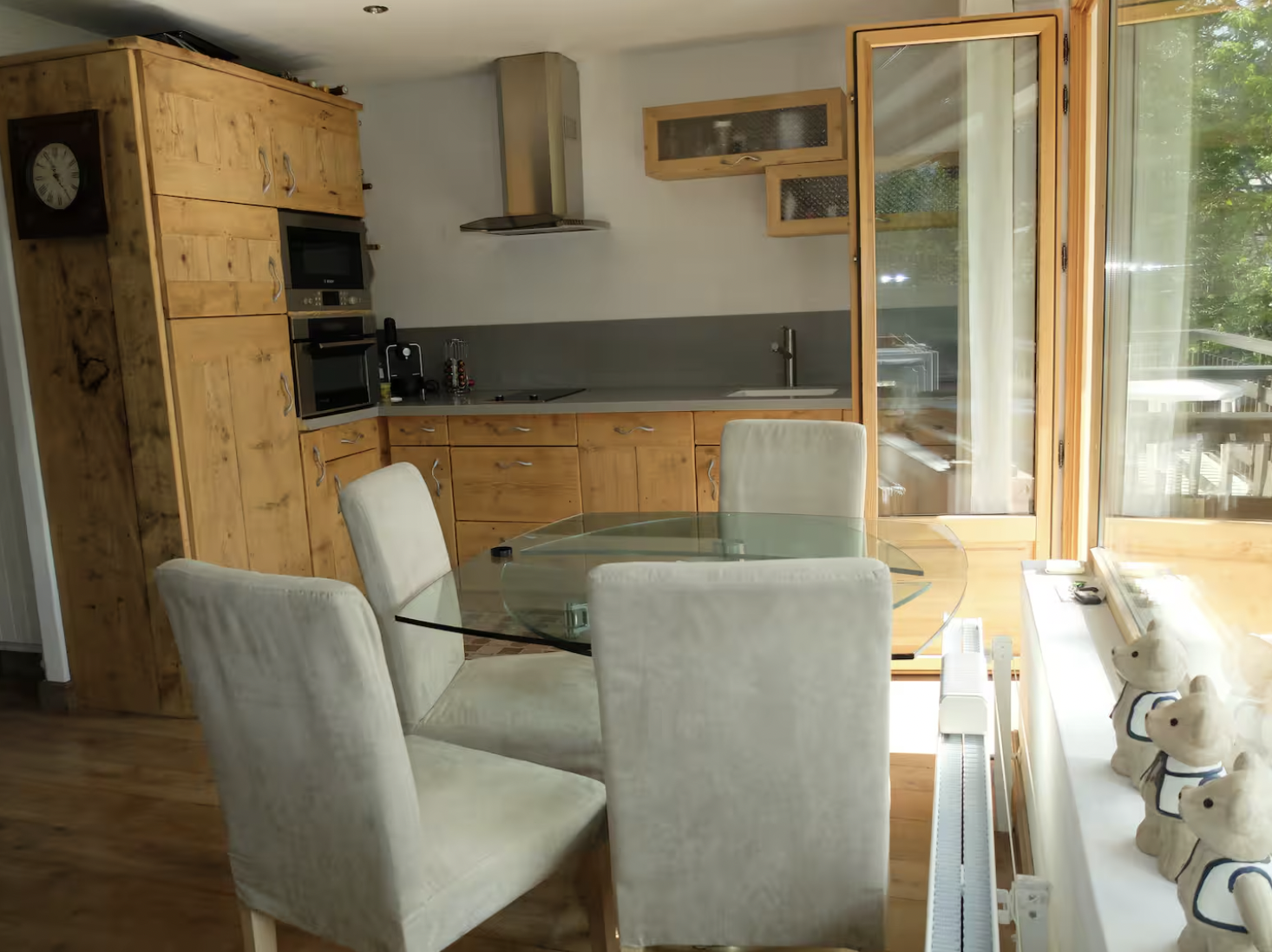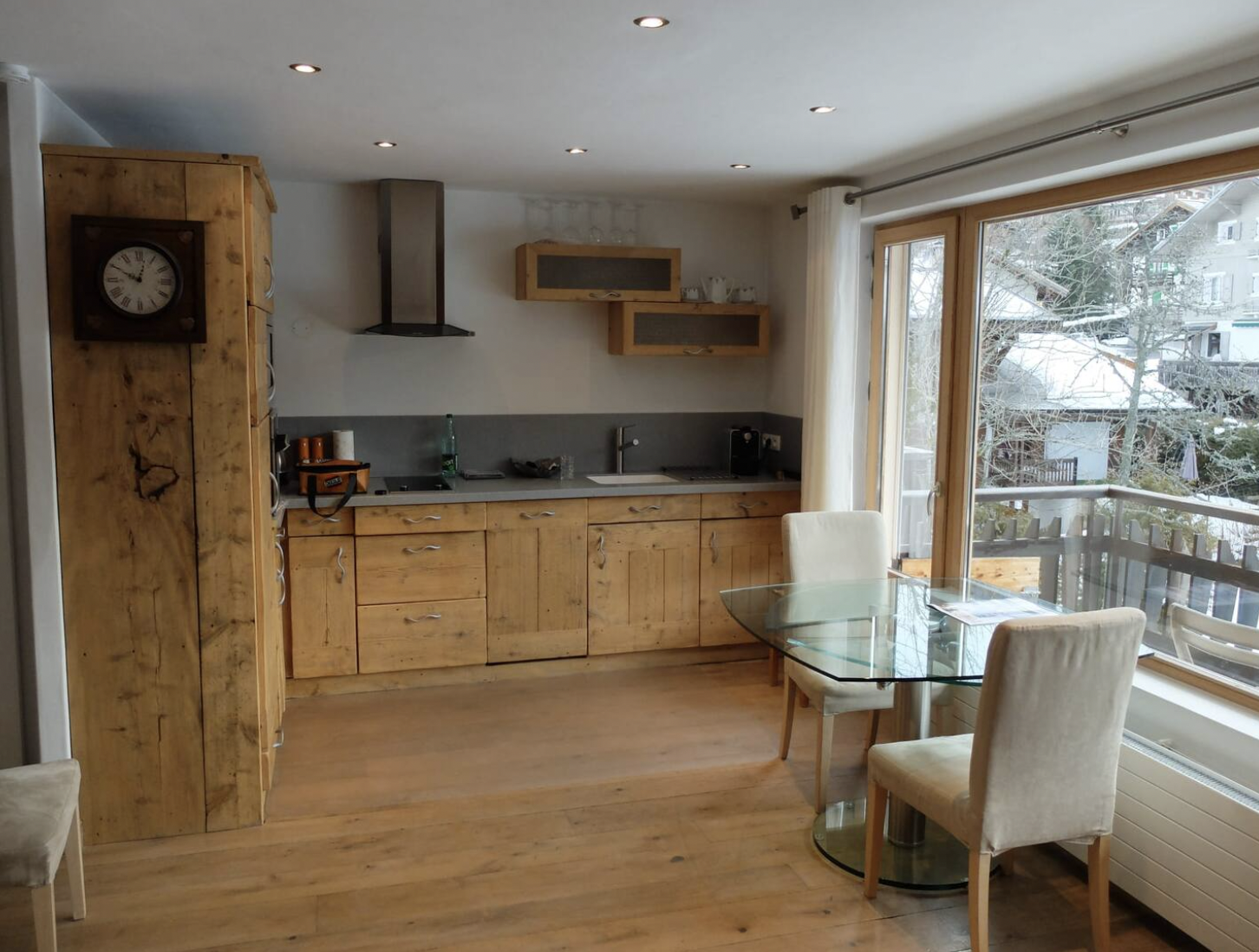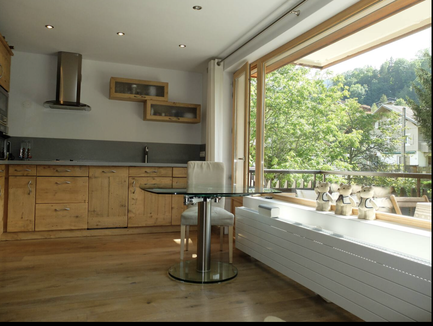 Espace de vie montagne et ultra moderne de grande qualité. Balcon ensoleillé avec table et chaises.