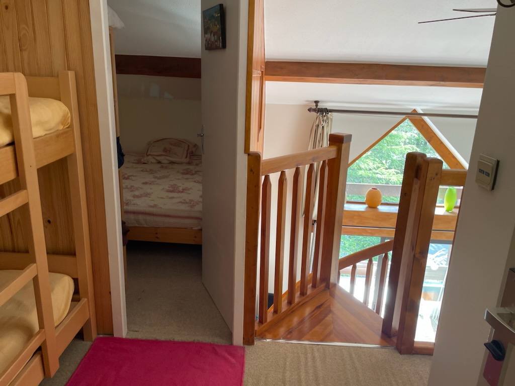 En mezzanine, 2 chambres (lit de 140) + couchages 2 lits superposés (lits de 90) 2 toilettes (une en bas, l’autre en mezzanine). 1 salle de bains en bas, 1 cabinet de toilettes en haut