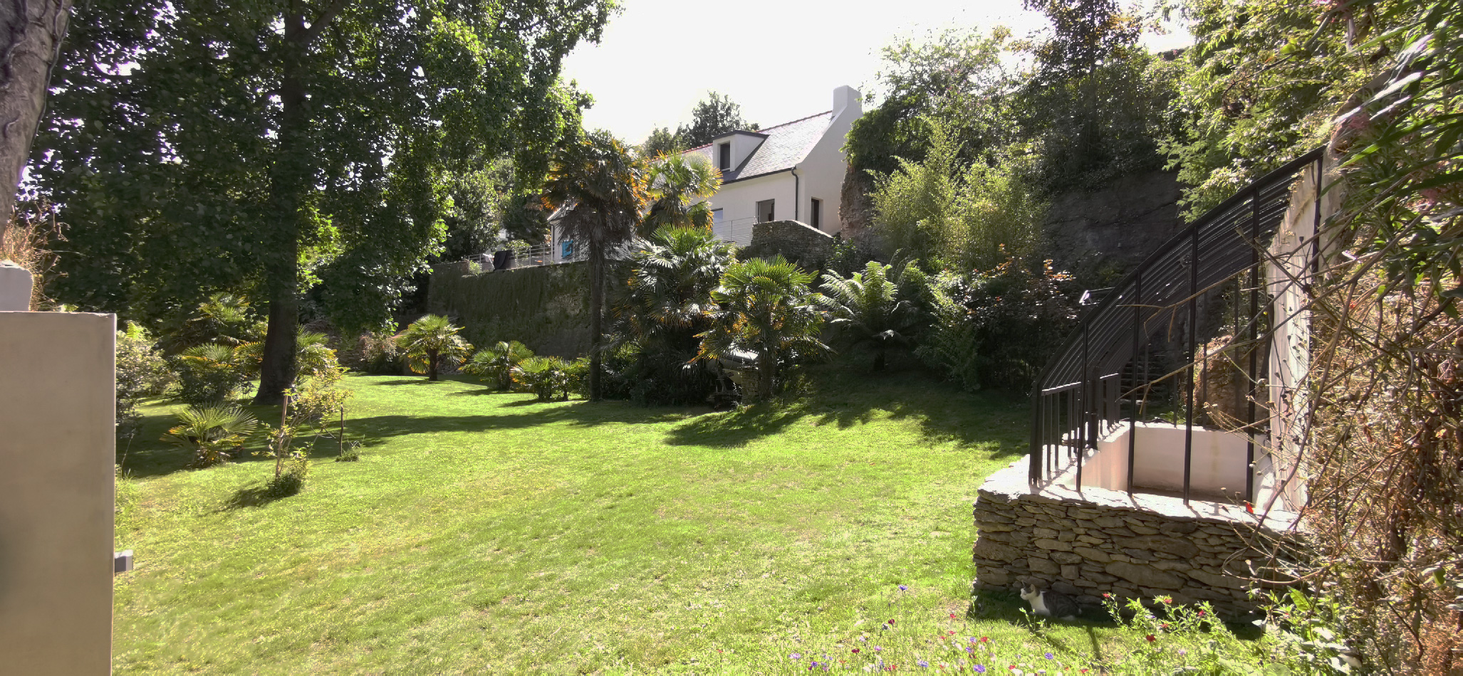 – Terrasse 100 m2 débordante sur grand jardin avec palmiers.