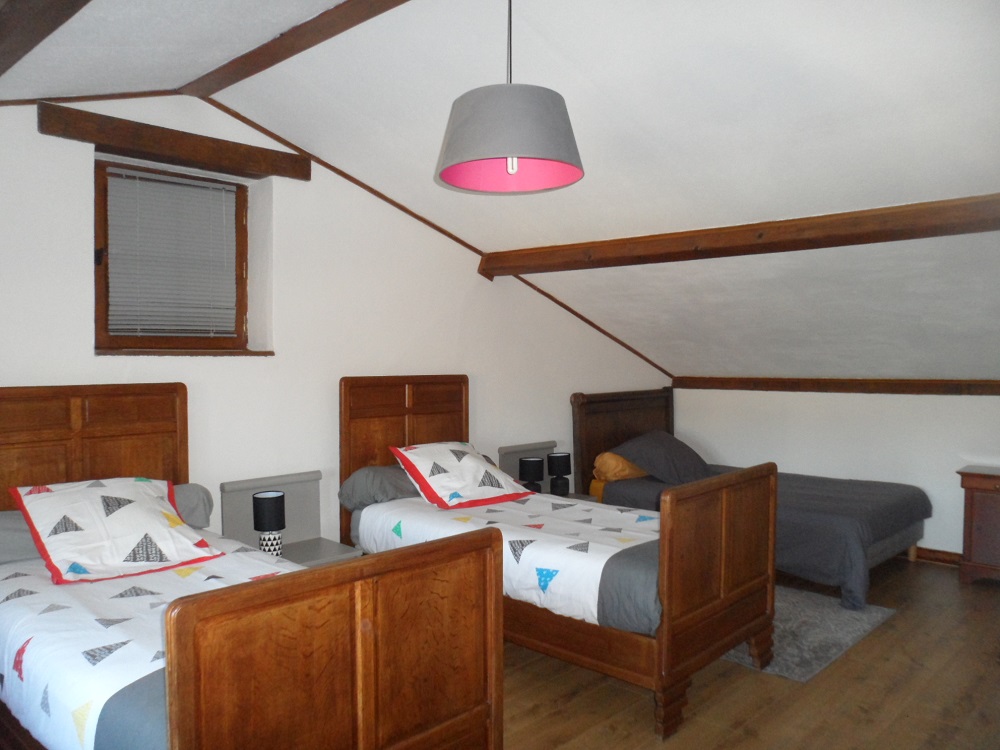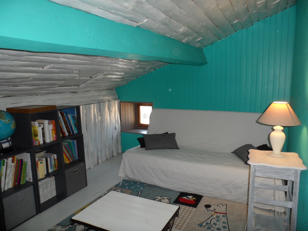 A l’étage un petit salon-bibliothèque avec télévision, une chambre avec 1 lit en 160 et une chambre avec 2 lits de 90 et 1 lit de 120 cm