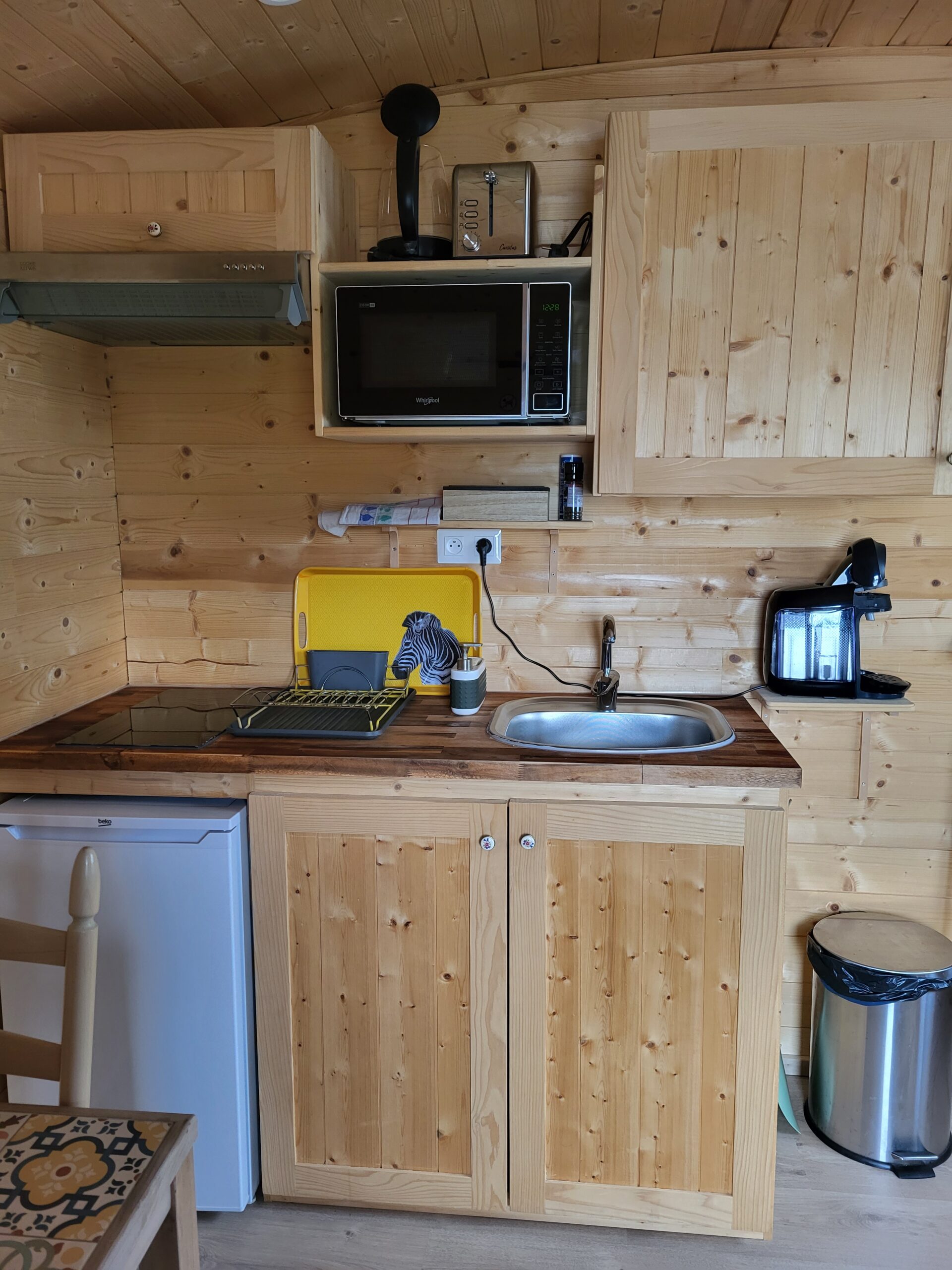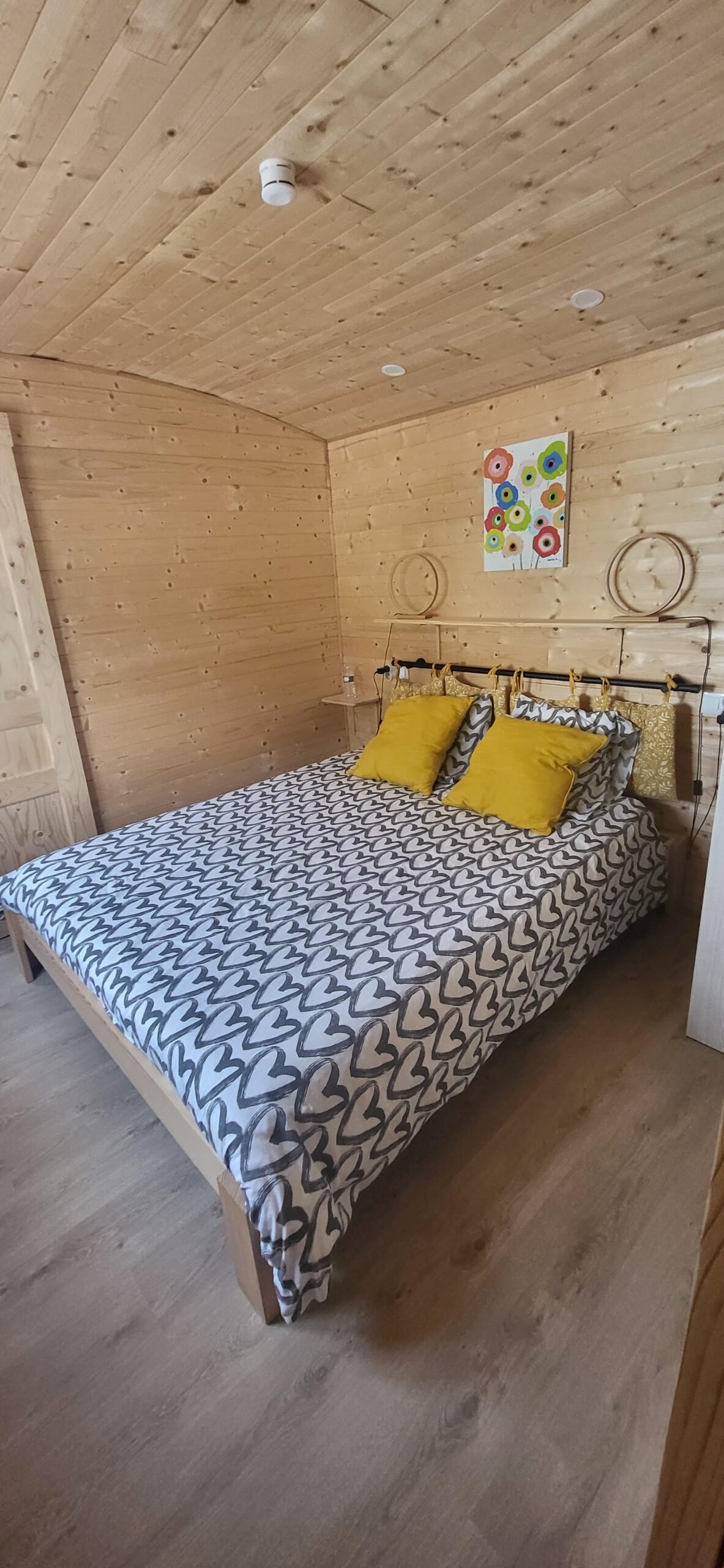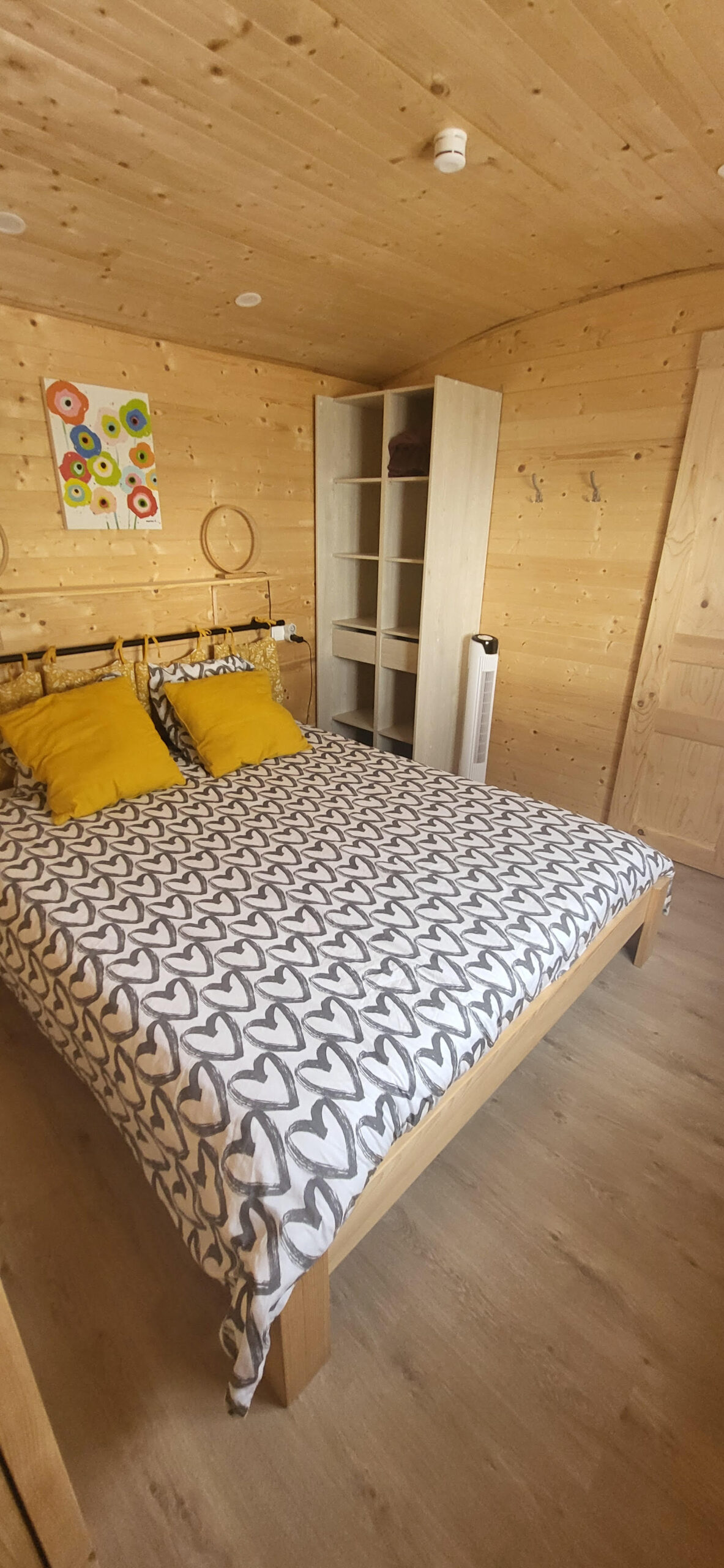Roulotte chauffée dans une résidence de 3 appartements. Cuisine aménagée avec coin salon. Une chambre avec 1 lit double, salle de bain avec WC. Résidence fermée et sécurisée. Place de parking. Spa et sauna en supplément.