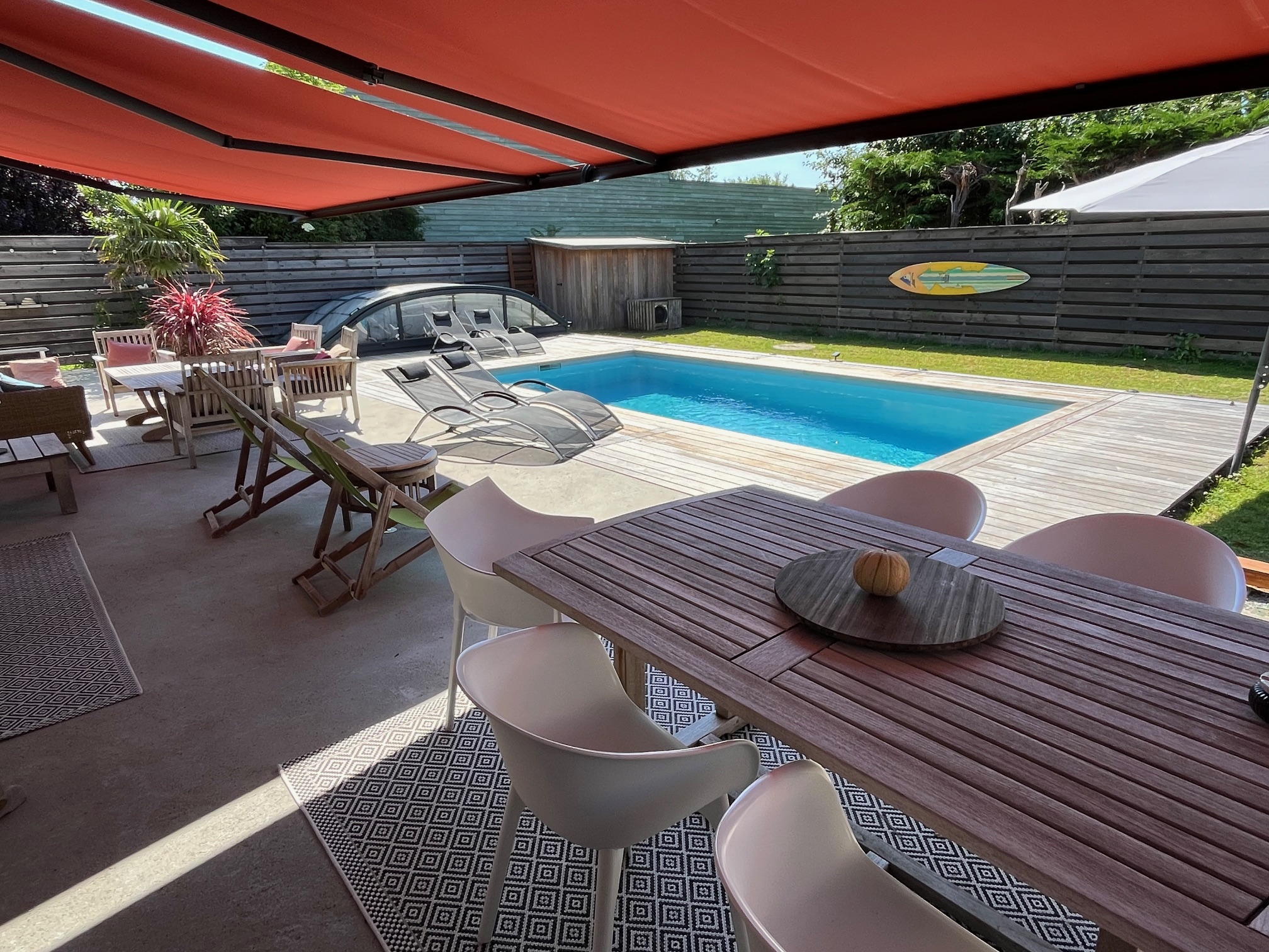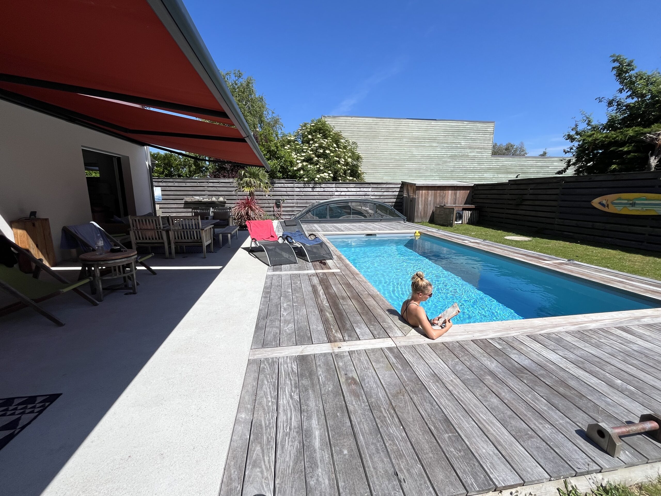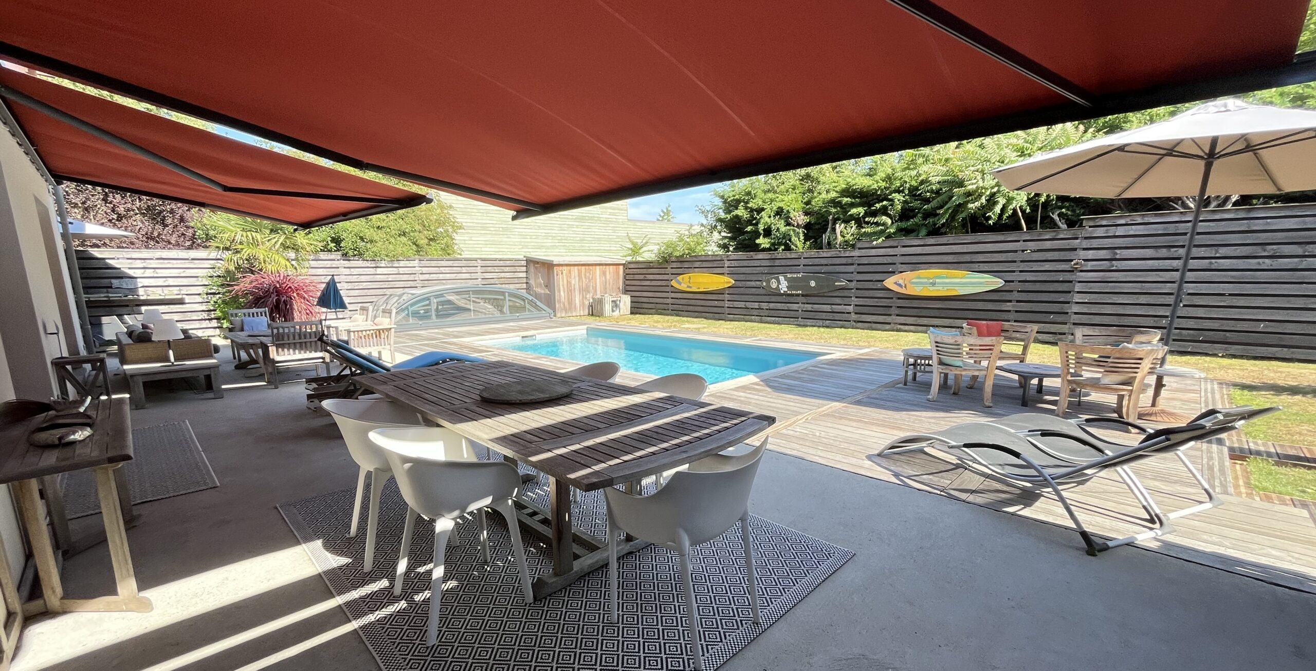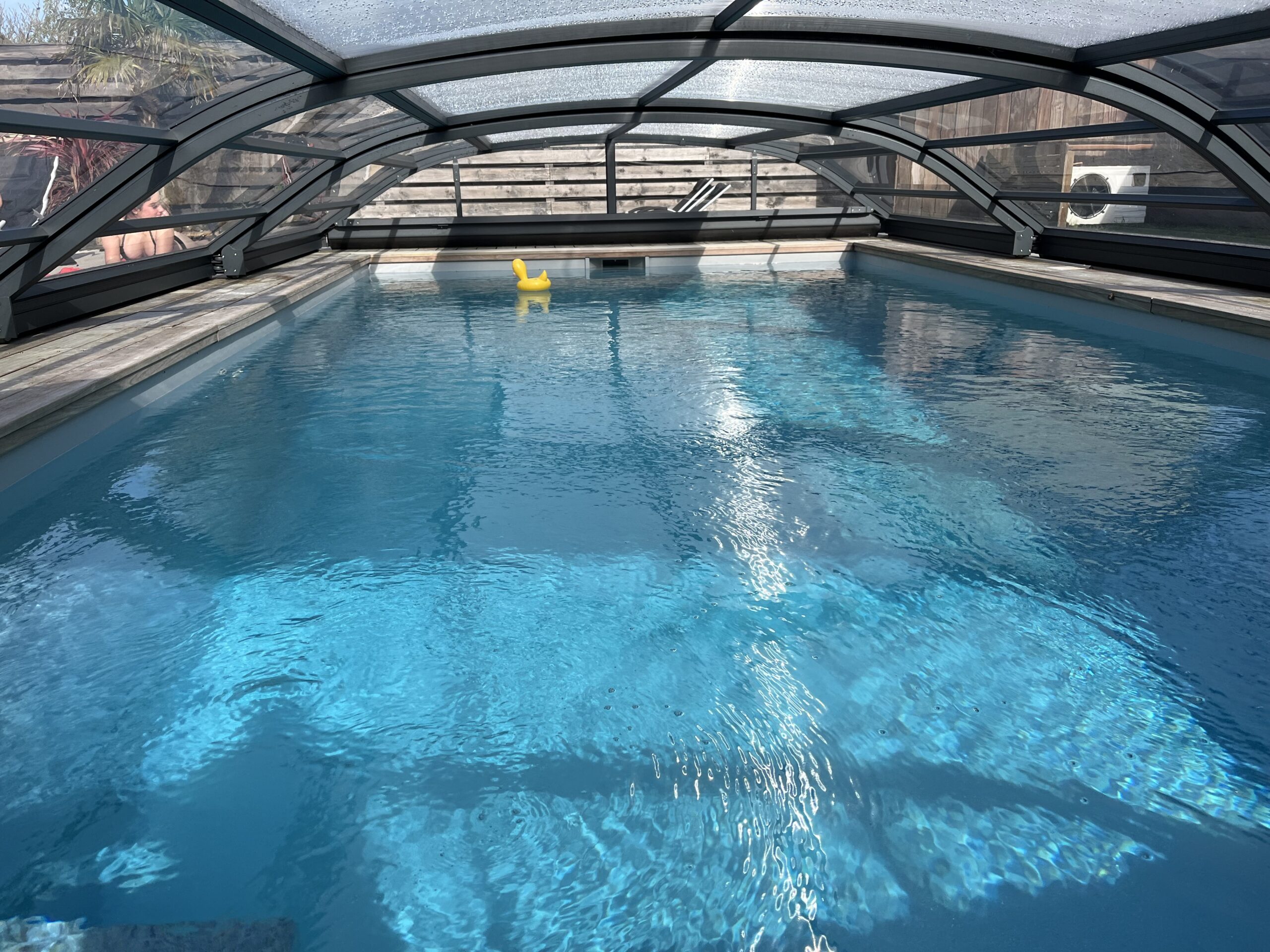 Recouverte d’un abris coulissant complètement escamotable, Il est possible de se baigner avec l’abri fermé à la mi-saison