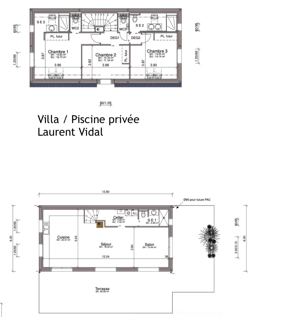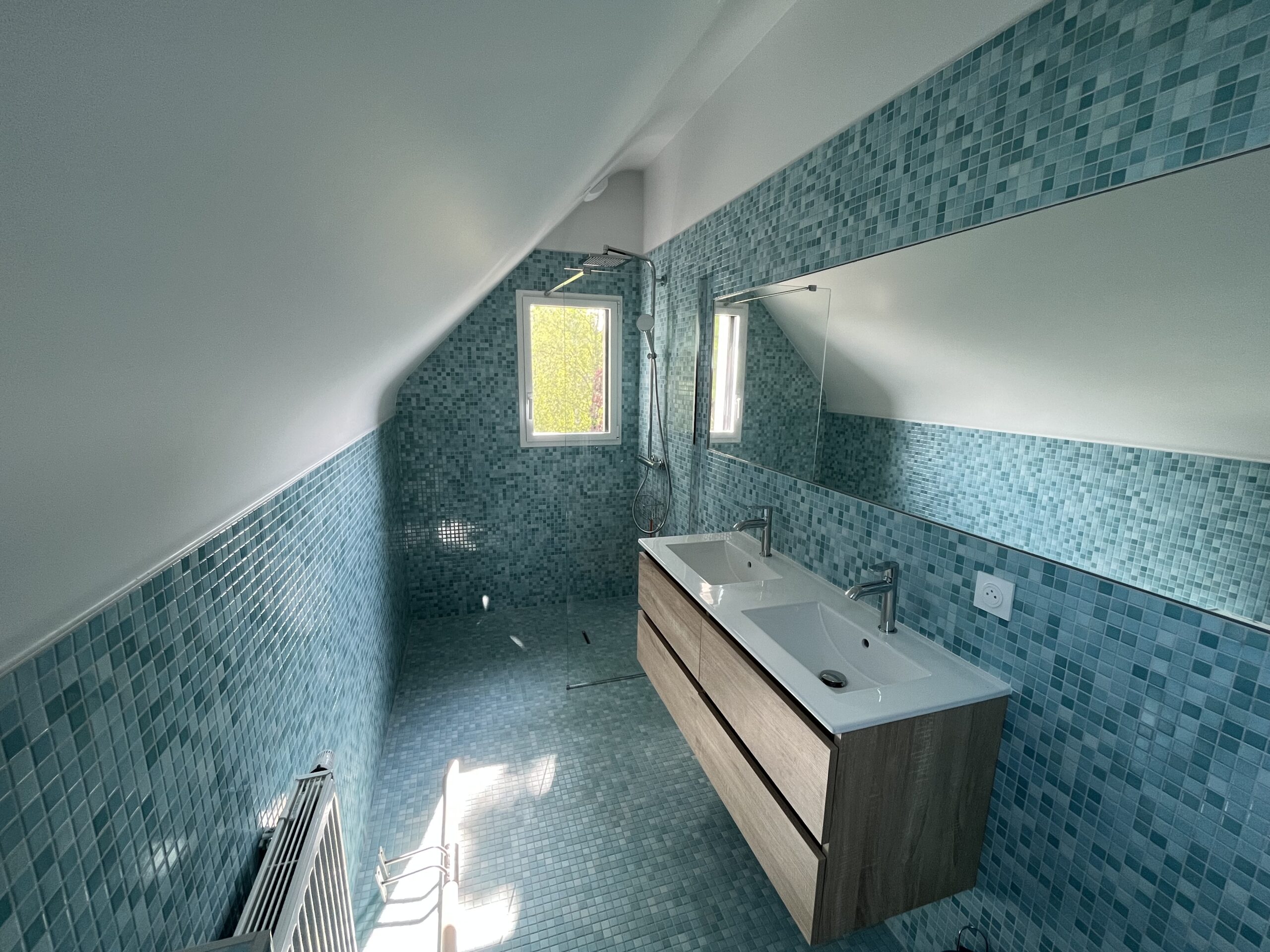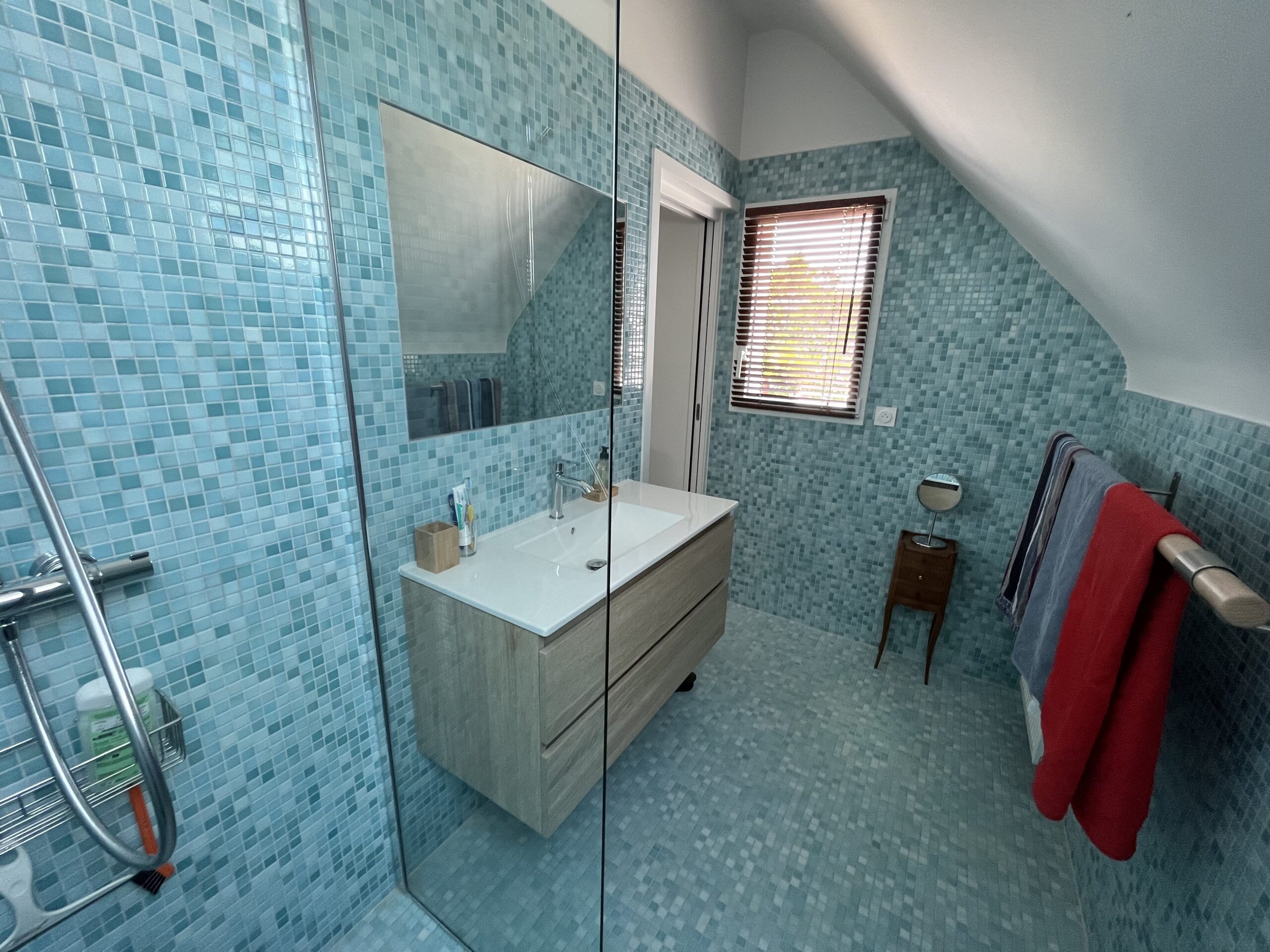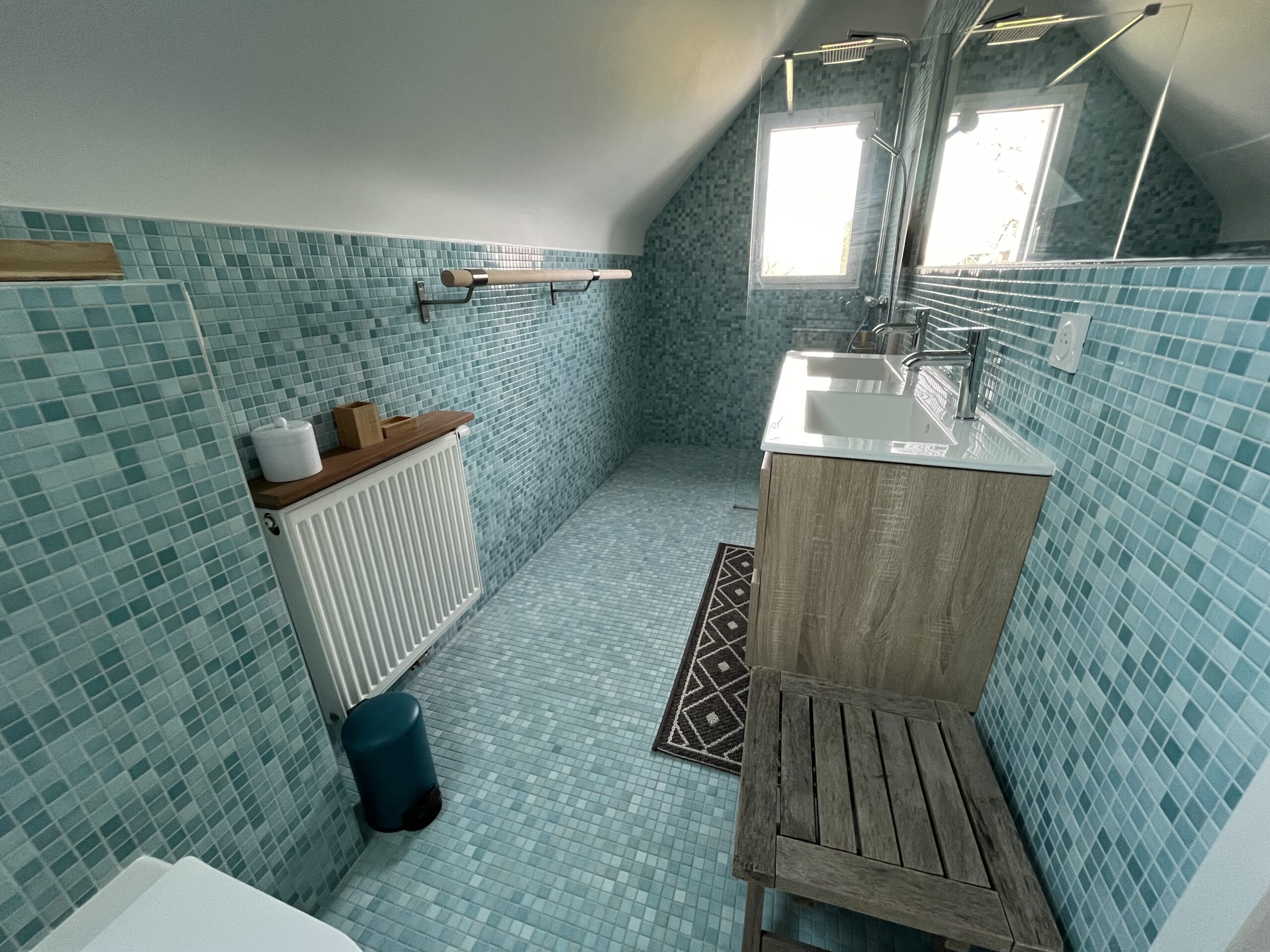A l’étage: Trois chambres doubles, 2 salles d’eau avec sanitaires et douche à l’italienne, 1 cabinet de toilette avec sanitaires et lavabo.