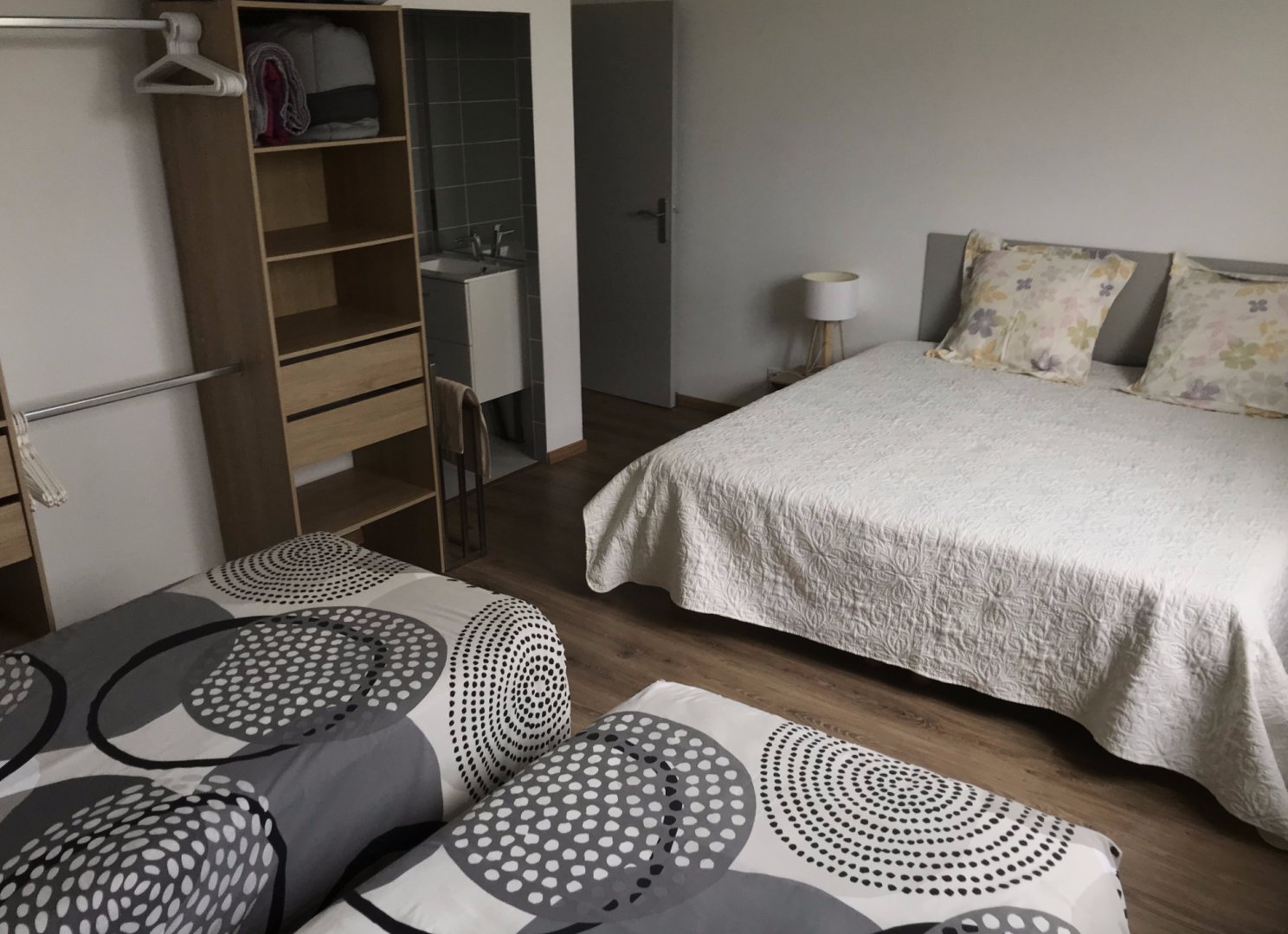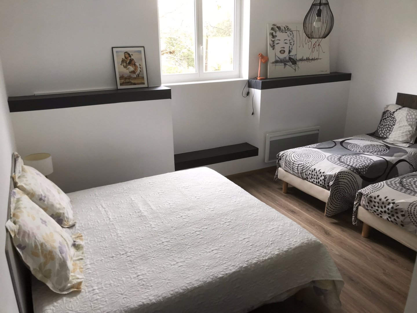 Espace nuit : 1 chambre au rez-de-chaussée, 1 suite parentale et 1 grande chambre familiale (4 lits simples) à l’étage.