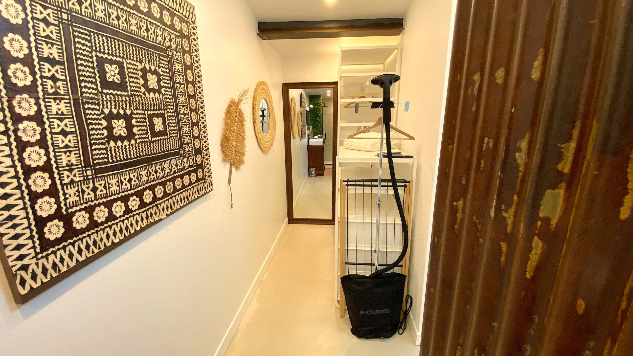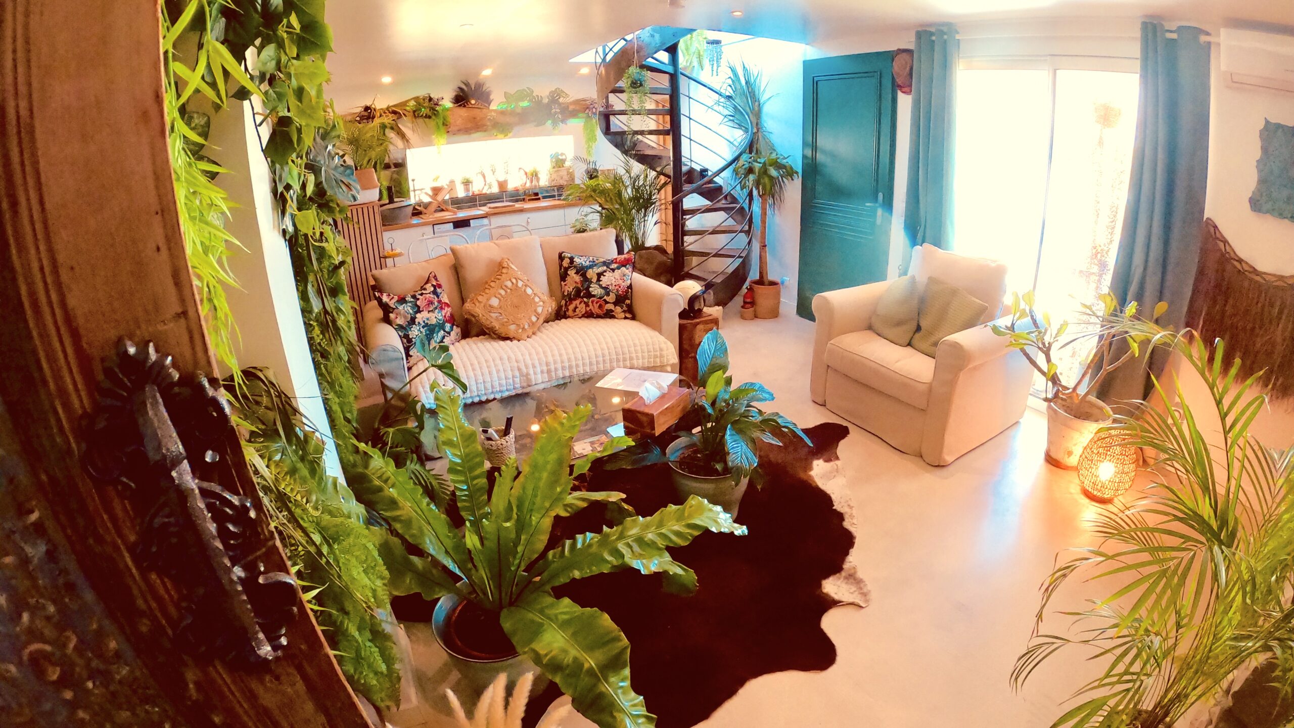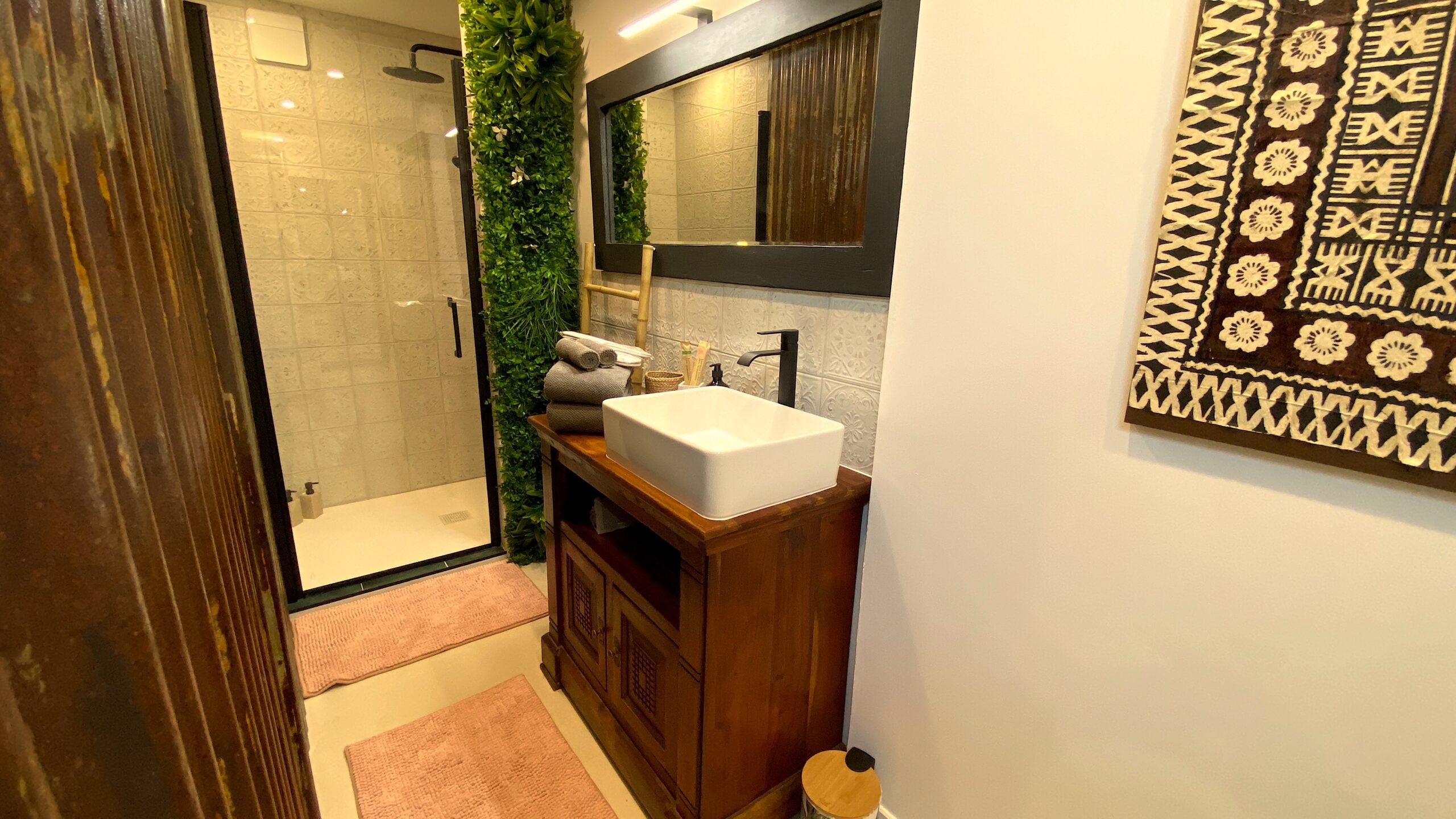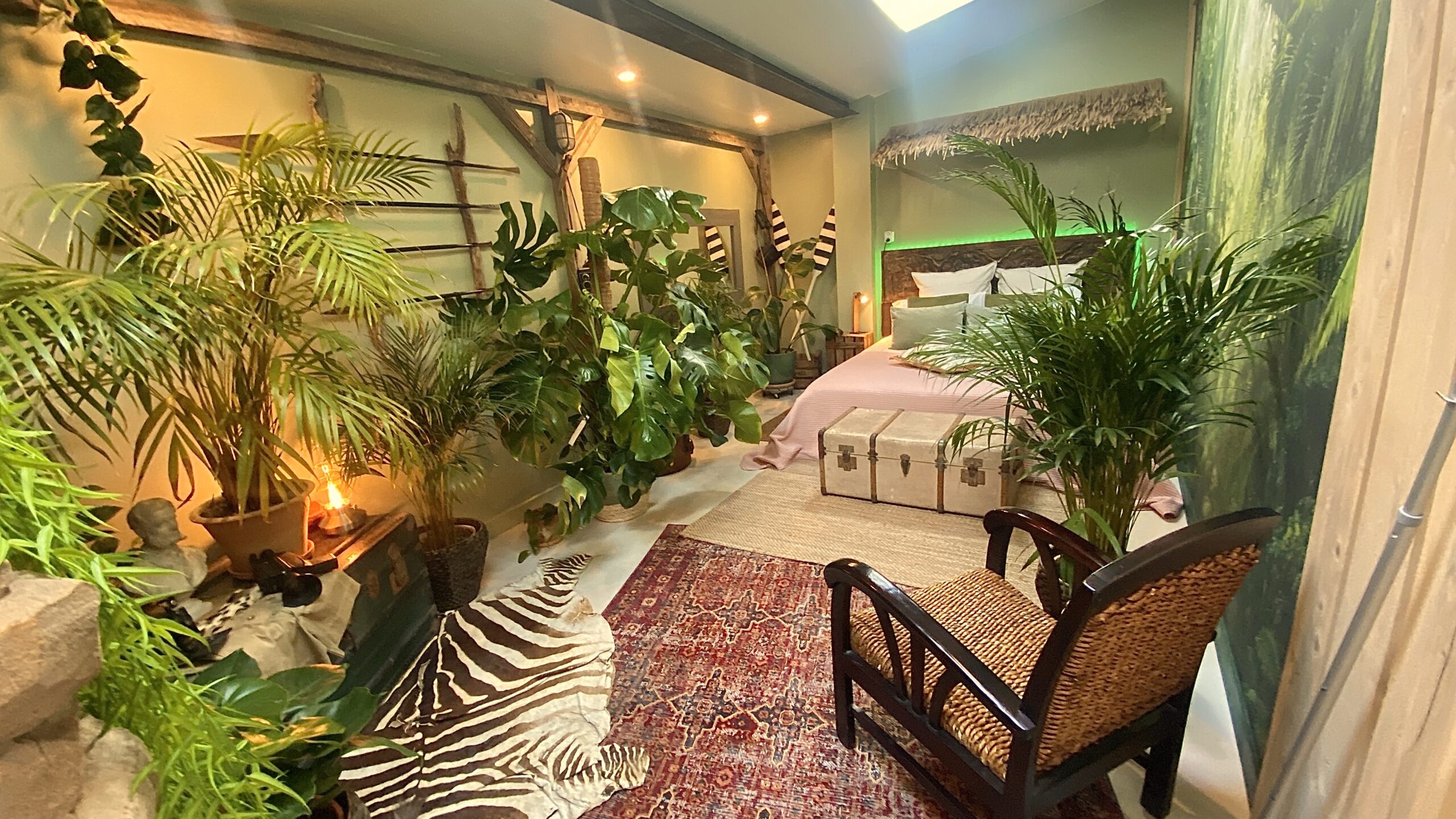 GRANDE CHAMBRE très cosy avec son dressing équipée d’un lit en 160/200 cm avec salle de douche et toilettes séparées tout confort dans un décor de jungle tropicale…
