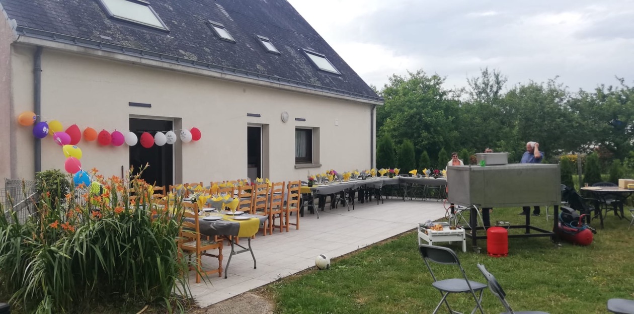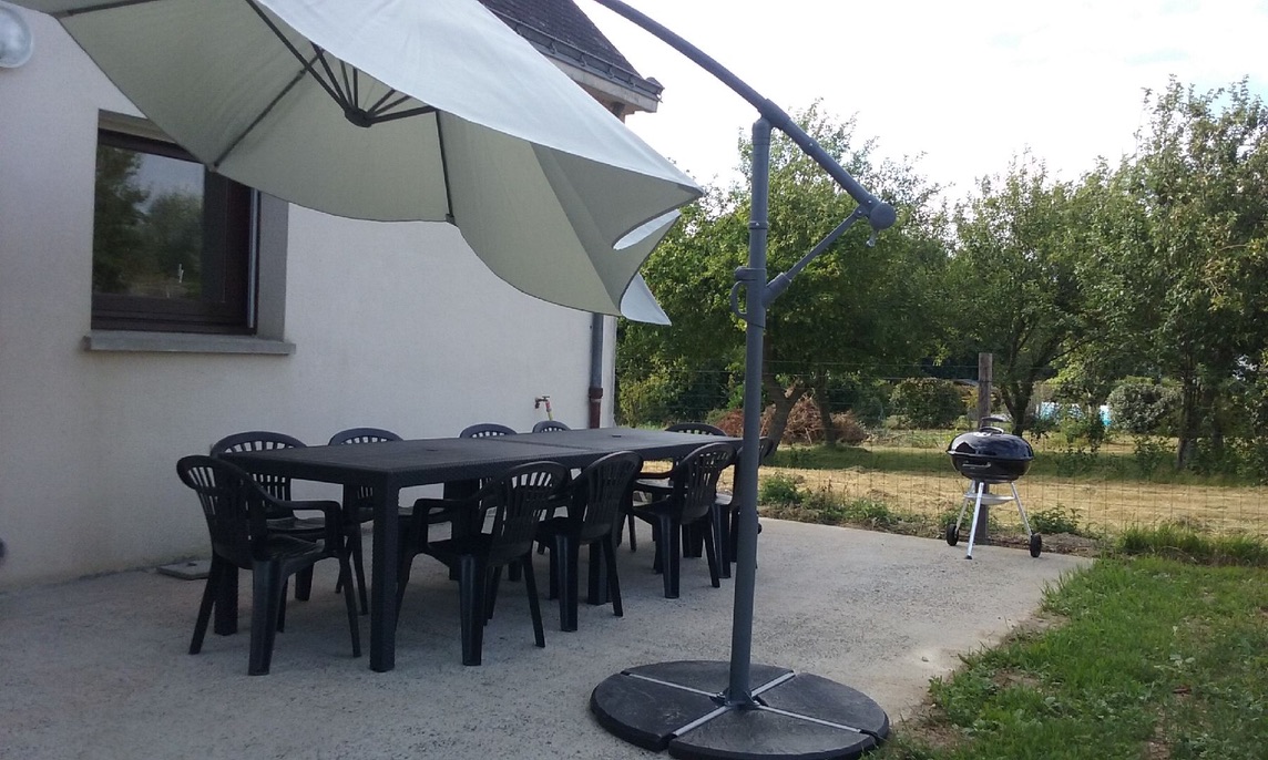 Grande terrasse de 50m2 avec tables, chaises, parasol…et table de pingpong.