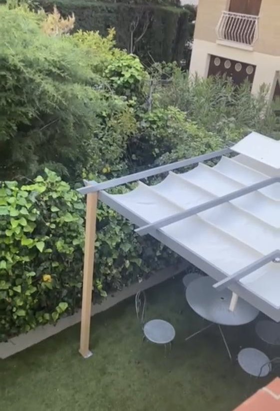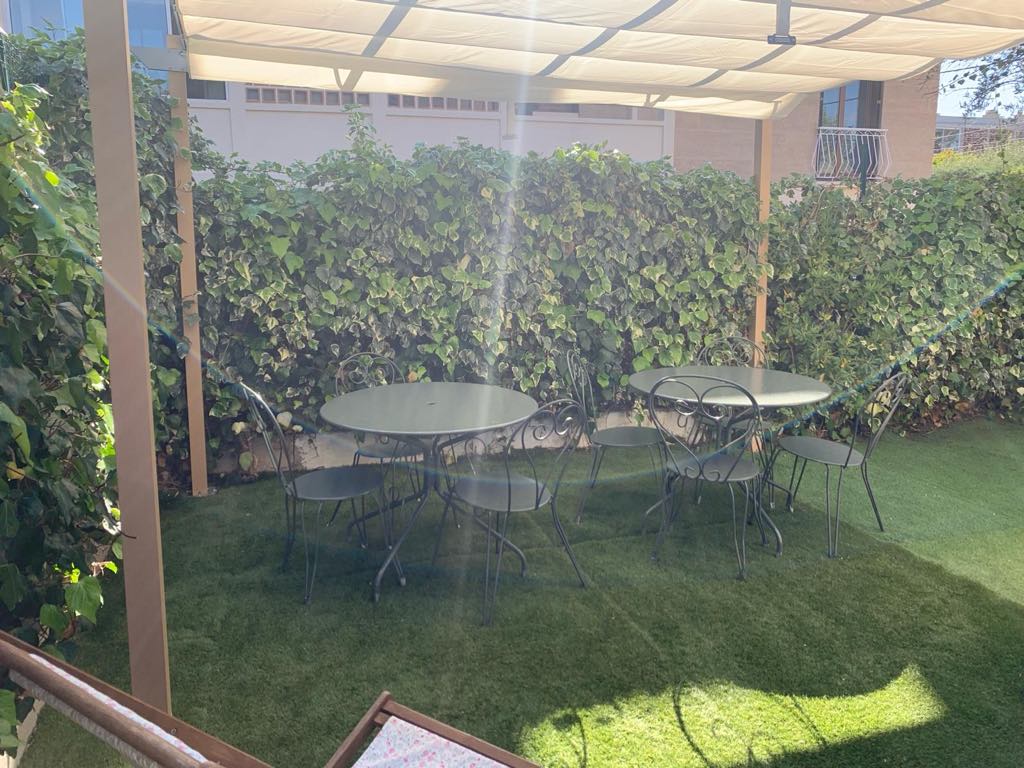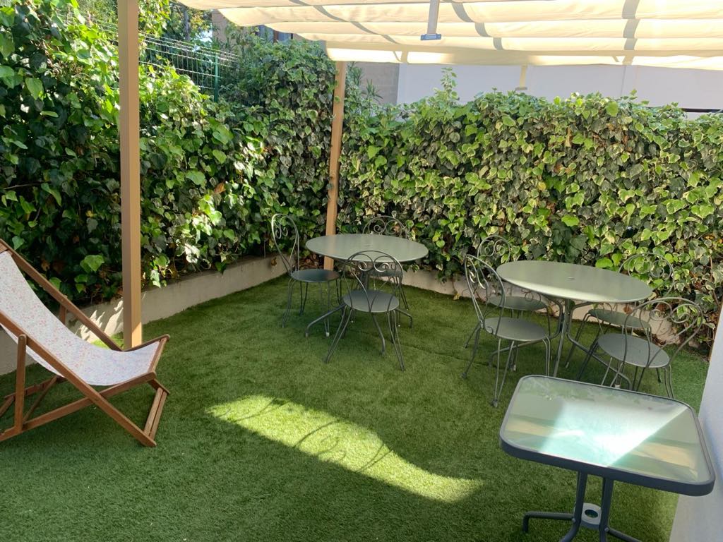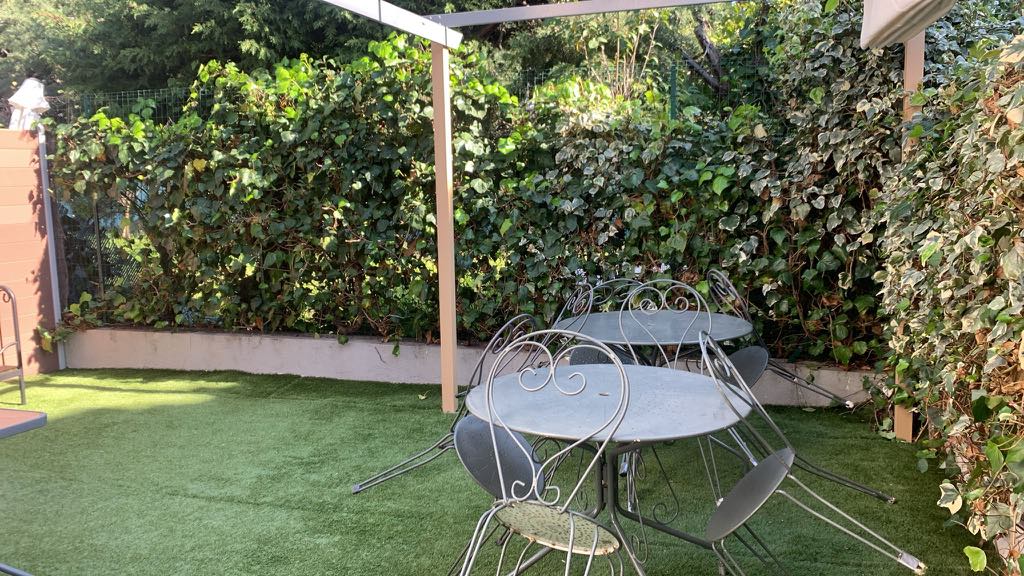 Parking privé et jardin aménagé (salon de jardin barbecue électrique).