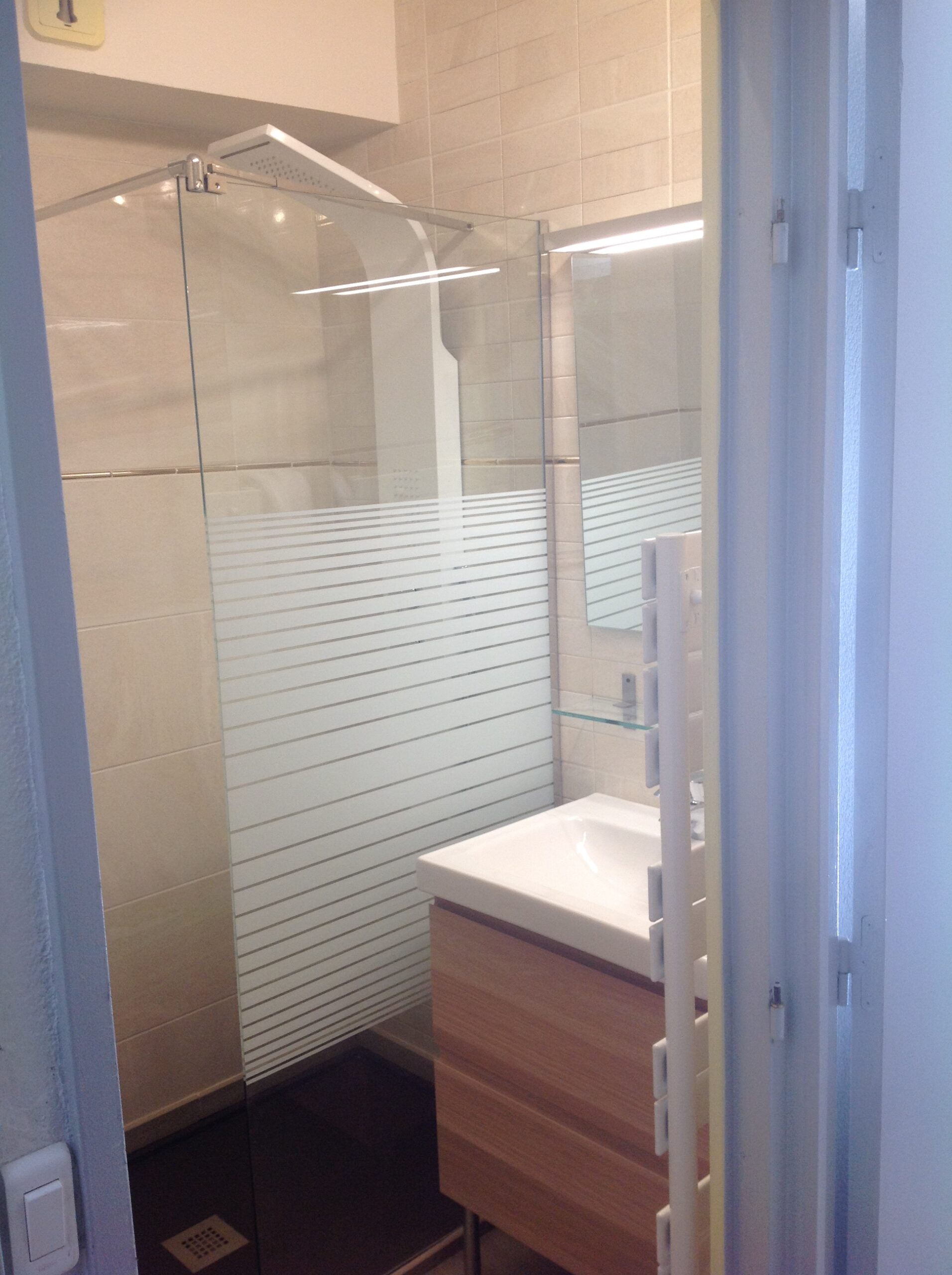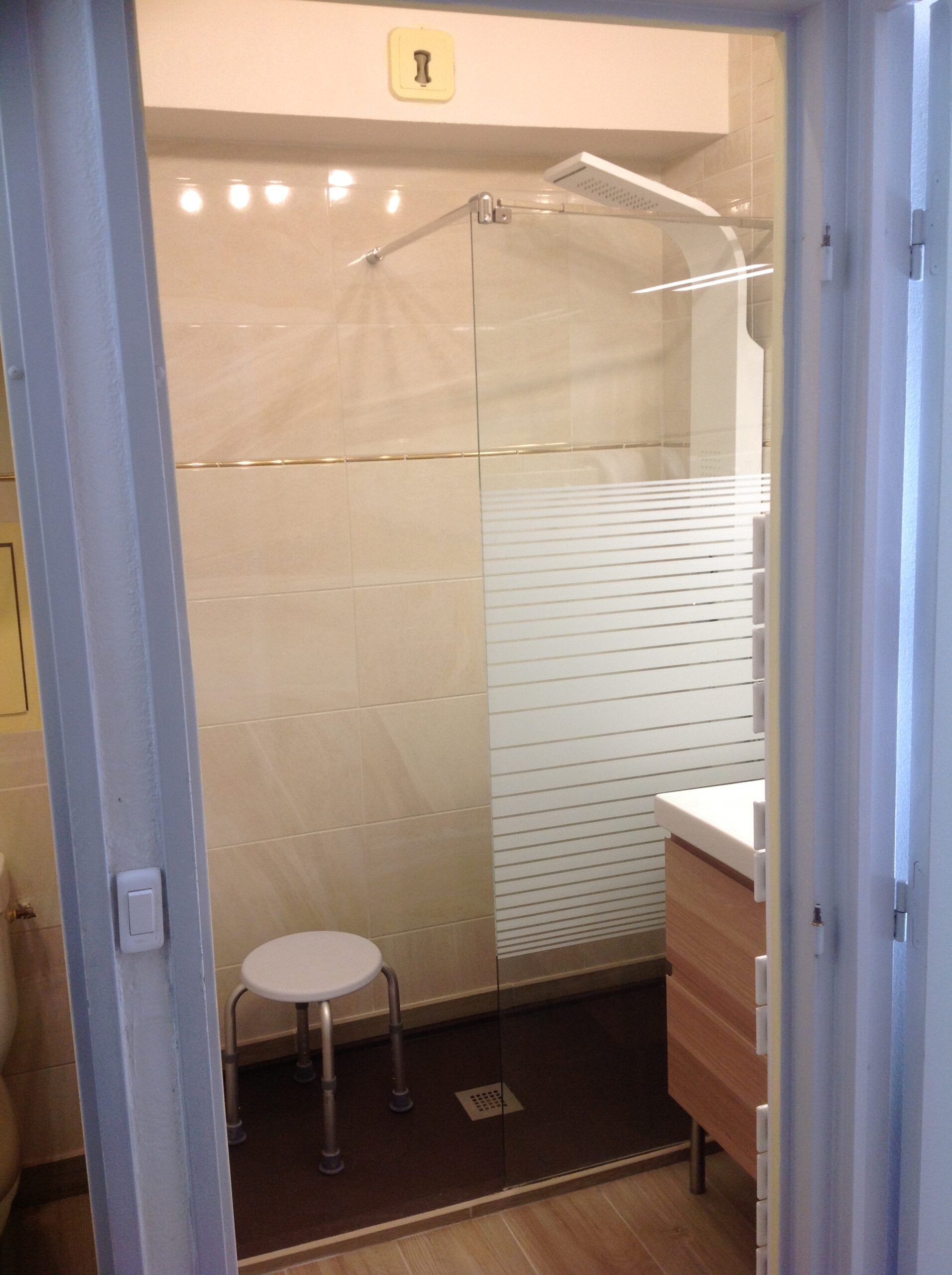 Douche à l’italienne, vasque + 2 tiroirs, sèche cheveux type hôtel, sèche serviette, tabouret