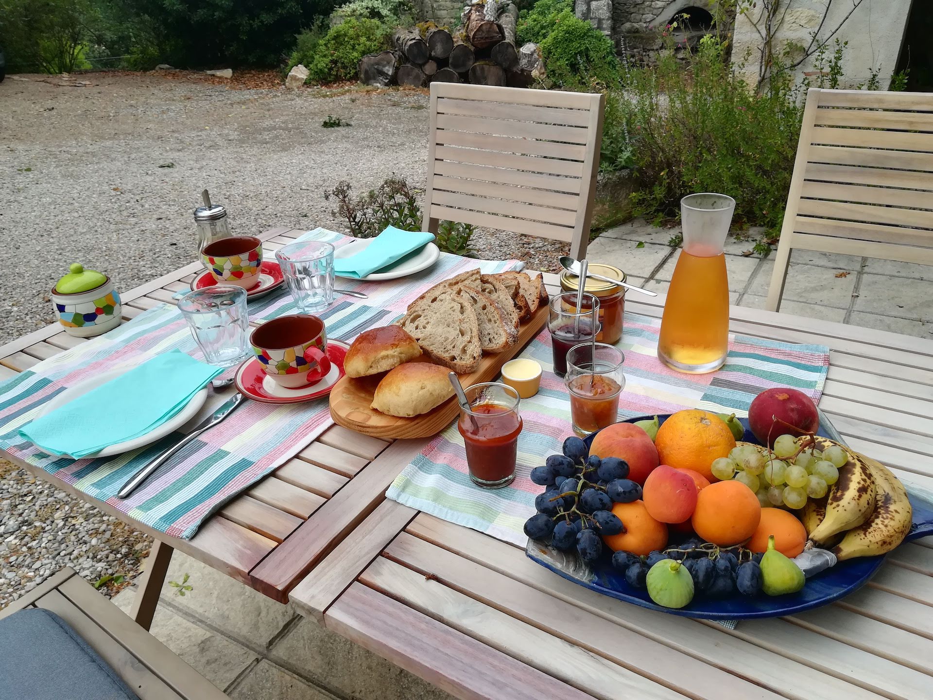 Je peux vous proposer aussi le petit déjeuner (en supplément). Parce que l’alimentation est notre première source d’énergie, je porte une attention particulière aux choix des produits. Ce sont des produits frais, locaux, la plupart bio. Vous dégusterez un pain au levain maison ou issu de paysan-boulanger de la région. Les gâteaux et les confitures sont faites maison avec un usage modéré du sucre. Si vous êtes plutôt salés, nous vous proposons aussi des oeufs ainsi que du fromage de la région.